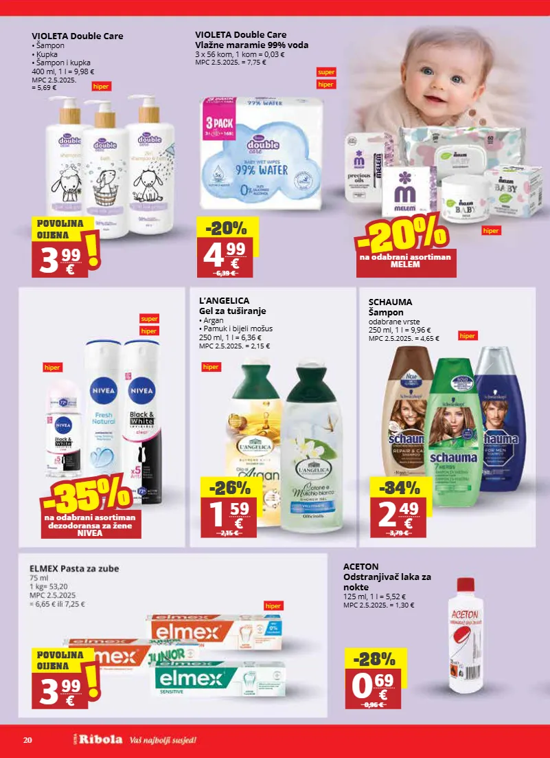 20 super hiper super hiper violeta double care vlažne maramie 99% voda 3 x 56 kom, 1 kom = 0,03 € mpc 2.5.2025. = 7,75 € aceton odstranjivač laka za nokte 125 ml, 1 l = 5,52 € mpc 2.5.2025. = 1,30 € violeta double care • šampon • kupka • šampon i kupka 400 ml, 1 l = 9,98 € mpc 2.5.2025. = 5,69 € -20% 4 99 6,39 € -28% 0 69 0,96 € 3 99 ! ! povoljna cijena -20% -20% na odabrani asortiman melem -35% -35% na odabrani asortiman dezodoransa za žene nivea hiper hiper hiper schauma šampon odabrane vrste 250 ml, 1 l = 9,96 € mpc 2.5.2025. = 4,65 € l’angelica gel za tuširanje • argan • pamuk i bijeli mošus 250 ml, 1 l = 6,36 € mpc 2.5.2025. = 2,15 € -34% 2 49 3,79 € -26% 1 59 2,15 € hiper hiper hiper 3 99 ! ! povoljna cijena