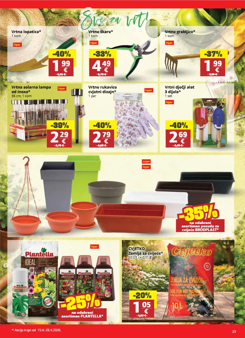 23 * akcija traje od 15.4.-28.4.2026. vrtne rukavice cvjetni dizajn* 1 par vrtne škare* 1 kom vrtne grabljice* 1 kom vrtna lopatica* 1 kom vrtni dječji alat 3 dijela* 1 set vrtna solarna lampa od inoxa* 36 cm, 1 kom cvjetko zemlja za cvijeće* 10 l, 1 l = 0,11 € -40% 2 79 4,69 € -33% 4 49 6,79 € -37% 1 99 3,19 € -40% 1 99 3,35 € -40% 2 69 4,49 € -39% 2 29 3,79 € -20% 1 05 1,32 € -25% -35% na odabrani asortiman posuda za cvijeće brodplast* -25% -25% na odabrani asortiman plantella* super hiper hiper hiper hiper hiper hiper hiper hiper