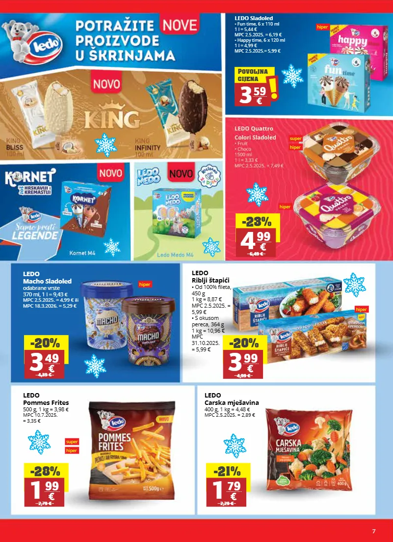 7 hiper hiper hiper super hiper super hiper hiper ledo pommes frites 500 g, 1 kg = 3,98 € mpc 10.7.2025. = 3,35 € ledo carska mješavina 400 g, 1 kg = 4,48 € mpc 2.5.2025. = 2,89 € ledo riblji štapići • od 100% fileta, 450 g 1 kg = 8,87 € mpc 2.5.2025. = 5,99 € • s okusom pereca, 364 g 1 kg = 10,96 € mpc 31.10.2025. = 5,99 € -20% 3 99 4,99 € -23% 4 99 6,49 € -28% 1 99 2,79 € -21% 1 79 2,29 € ledo macho sladoled odabrane vrste 370 ml, 1 l = 9,43 € mpc 2.5.2025. = 4,99 € ili mpc 18.3.2026. = 5,29 € -20% 3 49 4,39 € ledo sladoled • fun time, 6 x 110 ml 1 l = 5,44 € mpc 2.5.2025. = 6,19 € • happy time, 6 x 120 ml 1 l = 4,99 € mpc 2.5.2025.= 5,99 € 3 59 ! ! povoljna cijena