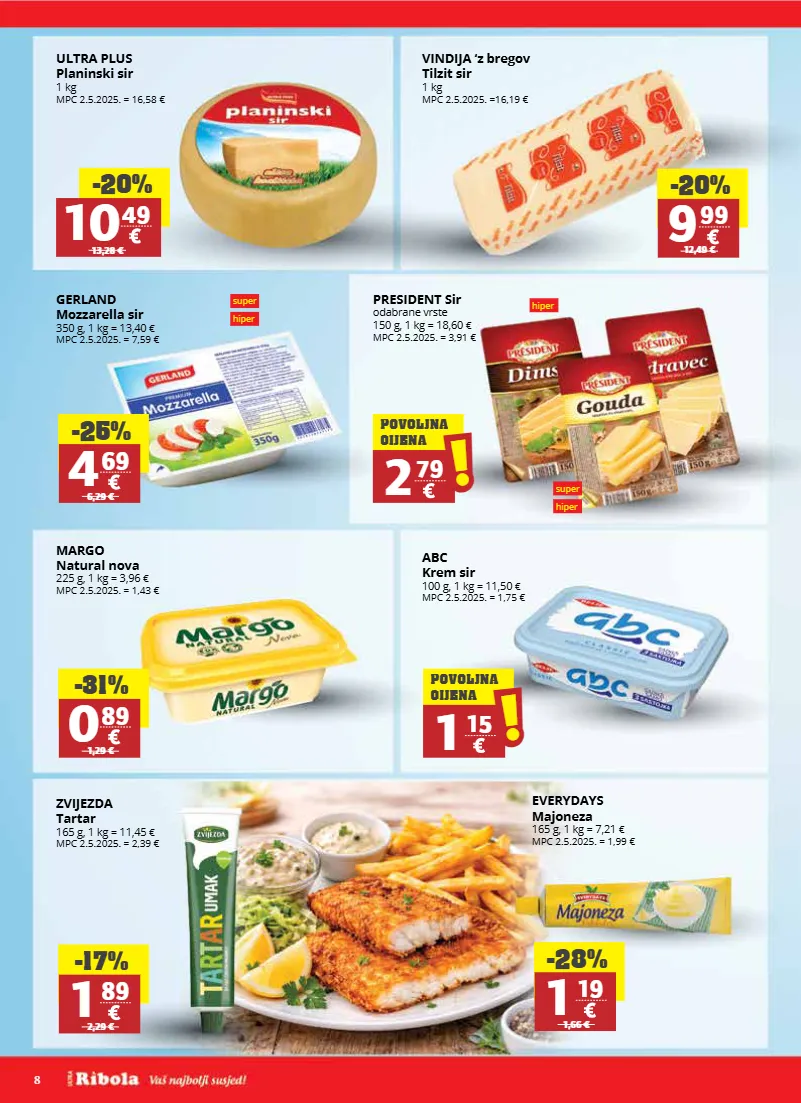 8 super hiper super hiper hiper ultra plus planinski sir 1 kg mpc 2.5.2025. = 16,58 € vindija ‘z bregov tilzit sir 1 kg mpc 2.5.2025. =16,19 € gerland mozzarella sir 350 g, 1 kg = 13,40 € mpc 2.5.2025. = 7,59 € president sir odabrane vrste 150 g, 1 kg = 18,60 € mpc 2.5.2025. = 3,91 € abc krem sir 100 g, 1 kg = 11,50 € mpc 2.5.2025. = 1,75 € margo natural nova 225 g, 1 kg = 3,96 € mpc 2.5.2025. = 1,43 € zvijezda tartar 165 g, 1 kg = 11,45 € mpc 2.5.2025. = 2,39 € everydays majoneza 165 g, 1 kg = 7,21 € mpc 2.5.2025. = 1,99 € -25% 4 69 6,29 € -20% 9 99 12,49 € -31% 0 89 1,29 € -17% 1 89 2,29 € -28% 1 19 1,66 € -20% 10 49 13,28 € 2 79 ! ! povoljna cijena 1 15 ! ! povoljna cijena