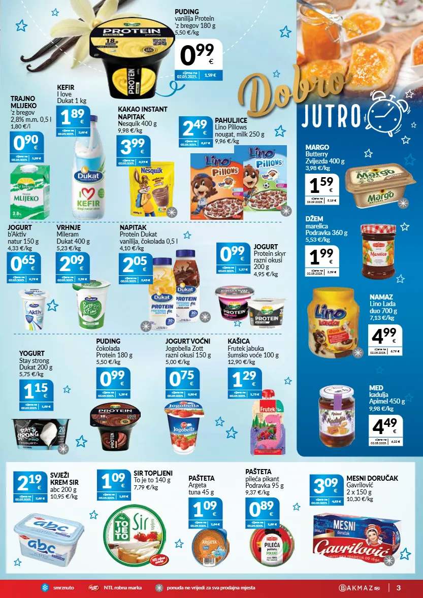 3 smrznutontl robna markaponuda ne vrijedi za sva prodajna mjesta ntl robna marka dobro jutro cijena na 02.05.2025. 1,59 € puding vanilija protein ‘z bregov 180 g 5,50 €/kg 0 99 € 0 90 € cijena na 02.05.2025. 1,09 € trajno mlijeko ‘z bregov 2,8% m.m. 0,5 l 1,80 €/l 3 99 € cijena na 02.05.2025. 6,25 € kakao instant napitak nesquik 400 g 9,98 €/kg 1 89 € cijena na 02.05.2025. 2,69 € kefir i love dukat 1 kg 2 49 € cijena na 02.05.2025. 3,67 € pahuljice lino pillows nougat, milk 250 g 9,96 €/kg 1 09 € cijena na 02.05.2025. 1,33 € sir topljeni to je to 140 g 7,79 €/kg 2 19 € cijena na 02.05.2025. 2,69 € svježi krem sir abc 200 g 10,95 €/kg 0 89 € cijena na 02.05.2025. 1,39 € pašteta pileća pikant podravka 95 g 9,37 €/kg 1 09 € cijena na 02.05.2025. 1,34 € pašteta argeta tuna 45 g 3 09 € cijena na 02.05.2025. 4,35 € mesni doručak gavrilović 2 x 150 g 10,30 €/kg 2 05 € cijena na 02.05.2025. 2,45 € napitak protein dukat vanilija, čokolada 0,5 l 4,10 €/kg 0 65 € cijena na 02.05.2025. 0,79 € jogurt b’aktiv natur 150 g 4,33 €/kg 2 09 € cijena na 02.05.2025. 2,59 € vrhnje mileram dukat 400 g 5,23 €/kg 0 99 € cijena na 02.05.2025. 1,57 € jogurt protein skyr razni okusi 200 g 4,95 €/kg kašica frutek jabuka šumsko voće 100 g 12,90 €/kg 1 29 € cijena na 02.05.2025. 1,75 € cijena na 02.05.2025. 1,39 € 1 15 € yogurt stay strong dukat 200 g 5,75 €/kg cijena na 02.05.2025. 1,59 € 0 99 € puding čokolada protein 180 g 5,50 €/kg cijena na 02.05.2025. 0,80 € 0 75 € jogurt voćni jogobella zott razni okusi 150 g 5,00 €/kg 4 49 € cijena na 02.05.2025. 6,22 € med kadulja apimel 450 g 9,98 €/kg 4 99 € cijena na 02.05.2025. 6,79 € namaz lino lada duo 700 g 7,13 €/kg 1 59 € cijena na 23.09.2025. 3,19 € margo butterry zvijezda 400 g 3,98 €/kg 1 99 € cijena na 02.05.2025. 2,59 € džem marelica podravka 360 g 5,53 €/kg ntl robna marka