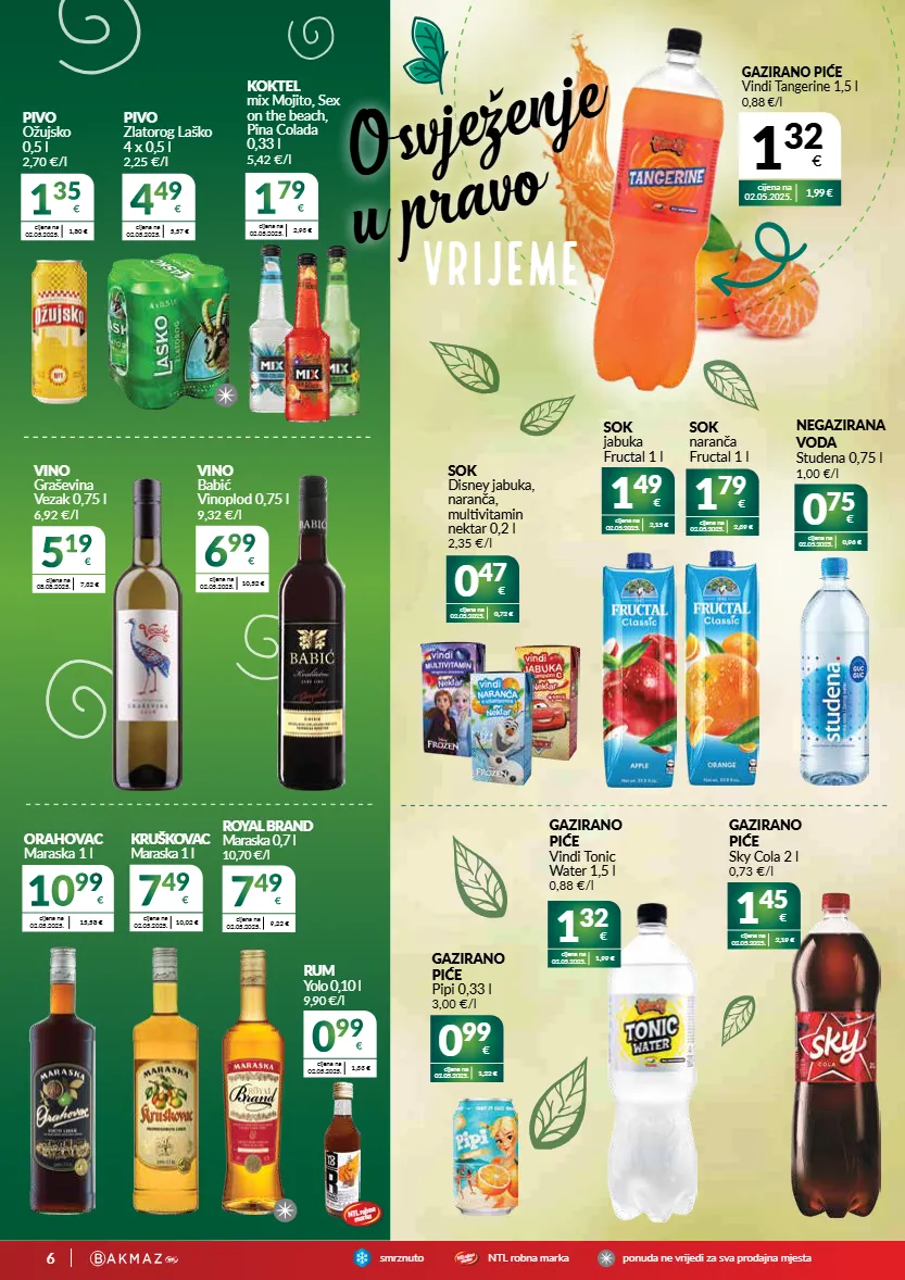 6 smrznutontl robna markaponuda ne vrijedi za sva prodajna mjesta ntl robna marka 0 99 € cijena na 02.05.2025. 1,22 € gazirano piće pipi 0,33 l 3,00 €/l 0 75 € cijena na 02.05.2025. 0,96 € negazirana voda studena 0,75 l 1,00 €/l 1 49 € cijena na 02.05.2025. 2,15 € sok jabuka fructal 1 l 1 79 € cijena na 02.05.2025. 2,39 € sok naranča fructal 1 l 0 47 € cijena na 02.05.2025. 0,72 € sok disney jabuka, naranča, multivitamin nektar 0,2 l 2,35 €/l 4 49 € cijena na 02.05.2025. 5,57 € pivo zlatorog laško 4 x 0,5 l 2,25 €/l 1 35 € cijena na 02.05.2025. 1,80 € pivo ožujsko 0,5 l 2,70 €/l 5 19 € cijena na 08.08.2025. 7,32 € vino graševina vezak 0,75 l 6,92 €/l 6 99 € cijena na 02.05.2025. 10,52 € vino babić vinoplod 0,75 l 9,32 €/l orahovac maraska 1 l 10 99 € cijena na 02.05.2025. 15,58 € 7 49 € cijena na 02.05.2025. 9,22 € royal brand maraska 0,7 l 10,70 €/l 0 99 € cijena na 02.05.2025. 1,33 € rum yolo 0,10 l 9,90 €/l cijena na 02.05.2025. 10,02 € 7 49 € kruškovac maraska 1 l 1 45 € cijena na 02.05.2025. 2,19 € gazirano piće sky cola 2 l 0,73 €/l 1 32 € cijena na 02.05.2025. 1,99 € gazirano piće vindi tonic water 1,5 l 0,88 €/l gazirano piće vindi tangerine 1,5 l 0,88 €/l 1 32 € cijena na 02.05.2025. 1,99 € osvježenje u pravo vrijeme 1 79 € cijena na 02.05.2025. 2,93 € koktel mix mojito, sex on the beach, pina colada 0,33 l 5,42 €/l ntl robna marka
