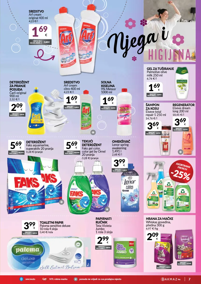 7 smrznutontl robna markaponuda ne vrijedi za sva prodajna mjesta ntl robna marka sredstvo arf cream original 400 ml 4,23 €/l 1 69 € cijena na 02.05.2025. 2,68 € 2 99 € cijena na 26.11.2025. 3,89 € papirnati ručnik teta violeta jumbo 1 rola 3 sloja 3 99 € cijena na 02.05.2025. 4,99 € toaletni papir paloma sensitive deluxe 10 rola 4 sloja 0,40 €/rola njega i higijena 3 69 € cijena na 02.05.2025. 4,95 € šampon za kosu elseve total repair 5 250 ml 14,76 €/l 3 69 € cijena na 02.05.2025. 5,27 € regenerator elseve dream long 200 ml 18,45 €/l 1 69 € cijena na 02.05.2025. 2,68 € sredstvo arf cream citro 400 ml 4,23 €/l 1 69 € cijena na 02.05.2025. 2,29 € solna kiselina 9% meteor 1000 ml 1 69 € cijena na 02.05.2025. 2,99 € gel za tuširanje palmolive olive milk 250 ml 6,76 €/l 5 69 € cijena na 26.01.2026. 10,19 € deterdžent faks aquamarine, superaktiv 20 pranja 0,28 €/pranje 5 69 € cijena na 26.01.2026. 10,19 € tekući deterdžent faks gel color, color gel by ornel 20 pranja 0,28 €/pranje 3 99 € cijena na 01.07.2025. 7,89 € omekšivač lenor spring awakening 1,491 l 2,68 €/l asortiman frosch -25% cijena na 02.05.2025. 2,89 € cijena na 02.05.2025. 2,76 € 2 09 € hrana za mačke whiskas govedina, piletina 300 g 6,97 €/kg 2 09 € cijena na 02.05.2025. 2,99 € deterdžent za pranje posuđa čarli original 900 ml 2,32 €/l