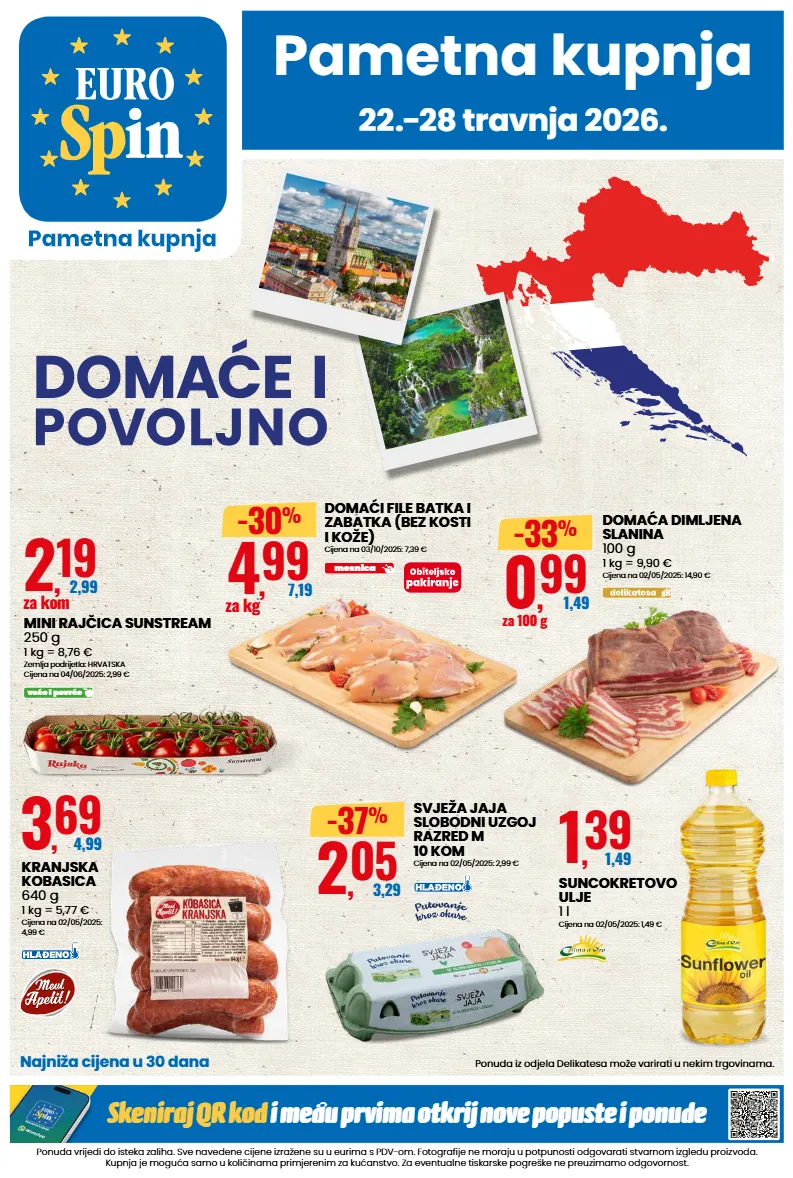 22.-28 travnja 2026. pametna kupnja ponuda vrijedi do isteka zaliha. sve navedene cijene izražene su u eurima s pdv-om. fotografije ne moraju u potpunosti odgovarati stvarnom izgledu proizvoda. kupnja je moguća samo u količinama primjerenim za kućanstvo. za eventualne tiskarske pogreške ne preuzimamo odgovornost. ponuda iz odjela delikatesa može varirati u nekim trgovinama. najniža cijena u 30 dana skeniraj qr kod i među prvima otkrij nove popuste i ponude kranjska kobasica 640 g 1 kg = 5,77 € cijena na 02/05/2025: 4,99 € 3 , 69 4,99 svježa jaja slobodni uzgoj razred m 10 kom cijena na 02/05/2025: 2,99 € 2 , 05 3,29 -37 % suncokretovo ulje 1 l cijena na 02/05/2025: 1,49 € 1 , 39 1,49 domaća dimljena slanina 100 g 1 kg = 9,90 € cijena na 02/05/2025: 14,90 € 0 , 99 1,49 za 100 g -33 % domaći file batka i zabatka (bez kosti i kože) cijena na 03/10/2025: 7,39 € 4 , 99 7,19 za kg mesnica -30 % mini rajčica sunstream 250 g 1 kg = 8,76 € zemlja podrijetla: hrvatska cijena na 04/06/2025: 2,99 € 2 , 19 2,99 za kom voće i povrće