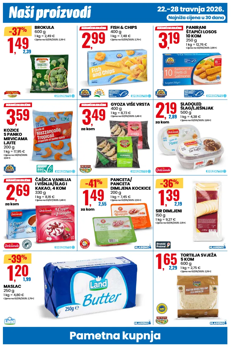 naši proizvodi pametna kupnja 22.-28 travnja 2026. najniža cijena u 30 dana 1 , 49 2,39 -37 % brokula 600 g 1 kg = 2,49 € cijena na 02/05/2025: 2,39 € 3 , 19 ograničena količina panirani štapići losos 10 kom 250 g 1 kg = 12,76 € cijena na 02/05/2025: 2,99 € 3 , 49 za kom ograničena količina gyoza više vrsta 400 g 1 kg = 8,73 € cijena na 02/05/2025: 3,49 € 2 , 19 2,89 za kom sladoled šlag/lješnjak 500 g 1 kg = 4,38 € cijena na 02/05/2025: 2,89 € 2 , 69 za kom ograničena količina čašica vanilija i višnja/šlag i kakao, 4 kom 330 g 1 kg = 8,16 € cijena na 03/07/2025: 2,49 € 1 , 49 2,55 za kom -41 % panceta/ panceta dimljena kockice 200 g 1 kg = 7,45 € cijena na 02/05/2025: 2,55 € 1 , 39 2,19 -36 % sir dimljeni 150 g 1 kg = 9,27 € cijena na 02/05/2025: 2,19 € 1 , 20 1,99 -39 % maslac 250 g 1 kg = 4,80 € cijena na 02/05/2025: 2,79 € 1 , 65 2,29 • p r o t e c t e d g e o g r a p h i c a l i n d i c a t i o n • tortilja svježa 5 kom 600 g 1 kg = 2,75 € cijena na 02/05/2025: 2,29 € 3 , 59 ograničena količina kozice s panko mrvicama ljute 200 g 1 kg = 17,95 € cijena na 24/03/2026: 3,59 € 2 , 99 samo ulje suncokretovo ograničena količina fish & chips 400 g 1 kg = 7,48 € cijena na 02/05/2025: 2,79 €
