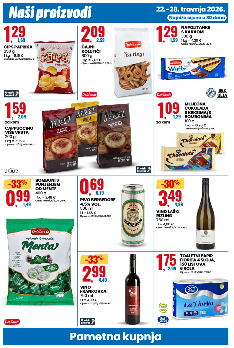 naši proizvodi pametna kupnja 22.-28. travnja 2026. najniža cijena u 30 dana 1 , 29 1,69 čips paprika 250 g 1 kg = 5,16 € cijena na 03/09/2025: 1,69 € 2 , 09 2,59 čajni kolutići 800 g 1 kg = 2,62 € cijena na 03/12/2025: 2,59 € 1 , 29 1,59 napolitanke s kakaom 300 g 1 kg = 4,30 € cijena na 08/07/2025: 1,49 € 1 , 59 2,09 za kom cappuccino više vrsta 200 g 1 kg = 7,95 € cijena na 17/07/2025: 1,99 € 1 , 09 1,29 za kom mliječna čokolada s keksima/s bombonima 100 g 1 kg = 10,90 € cijena na 02/05/2025: 1,29 € 0 , 99 1,49 -33 % bomboni s punjenjem od mente 400 g 1 kg = 2,48 € cijena na 02/05/2025: 1,49 € 0 , 69 0,79 pivo bergedorf 4,5% vol. 500 ml 1 l = 1,38 € cijena na 02/05/2025: 0,79 € 3 , 49 4,99 -30 % vino laški rizling 750 ml 1 l = 4,66 € cijena na 02/05/2025: 4,99 € 2 , 99 4,49 -33 % vino frankovka 750 ml 1 l = 3,99 € cijena na 02/05/2025: 4,49 € 1 , 75 2,09 50% recycled plastic toaletni papir fiorita 4 sloja, 150 listova, 6 rola cijena na 02/05/2025: 2,09 €