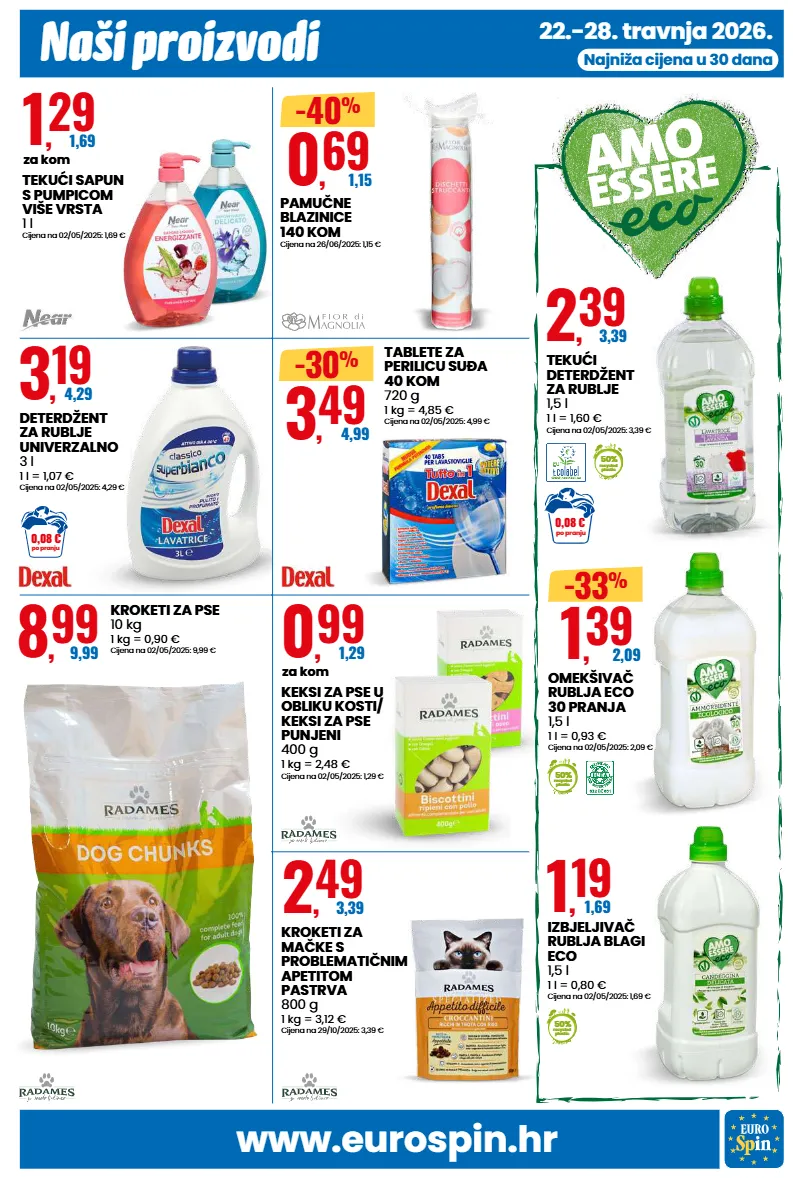 www.eurospin.hr naši proizvodi 22.-28. travnja 2026. najniža cijena u 30 dana 1 , 29 1,69 za kom tekući sapun s pumpicom više vrsta 1 l cijena na 02/05/2025: 1,69 € 0 , 69 1,15 -40 % pamučne blazinice 140 kom cijena na 26/06/2025: 1,15 € 3 , 49 4,99 -30 % tablete za perilicu suða 40 kom 720 g 1 kg = 4,85 € cijena na 02/05/2025: 4,99 € 8 , 99 9,99 kroketi za pse 10 kg 1 kg = 0,90 € cijena na 02/05/2025: 9,99 € 0 , 99 1,29 za kom keksi za pse u obliku kosti/ keksi za pse punjeni 400 g 1 kg = 2,48 € cijena na 02/05/2025: 1,29 € 2 , 49 3,39 kroketi za mačke s problematičnim apetitom pastrva 800 g 1 kg = 3,12 € cijena na 29/10/2025: 3,39 € 1 , 39 2,09 50% recycled plastic -33 % omekšivač rublja eco 30 pranja 1,5 l 1 l = 0,93 € cijena na 02/05/2025: 2,09 € 1 , 19 1,69 50% recycled plastic izbjeljivač rublja blagi eco 1,5 l 1 l = 0,80 € cijena na 02/05/2025: 1,69 € 3 , 19 4,29 po pranju deterdžent za rublje univerzalno 3 l 1 l = 1,07 € cijena na 02/05/2025: 4,29 € 0,08 € 2 , 39 3,39 50% recycled plastic tekući deterdžent za rublje 1,5 l 1 l = 1,60 € cijena na 02/05/2025: 3,39 € po pranju 0,08 €