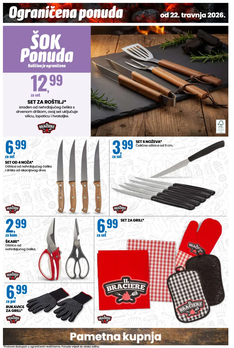 pametna kupnja *proizvod dostupan u ograničenim količinama. ponuda vrijedi do isteka zaliha. ograničena ponuda od 22. travnja 2026. škare* oštrice od nehrđajućeg čelika. 2 , 99 za kom set 6 noževa* čelična oštrica od 11 cm. 3 , 99 za set set za grill* 6 , 99 za set rukavice za grill* 6 , 99 za par set od 4 noža* oštrica od nehrđajućeg čelika i drška od akacijevog drva. 6 , 99 za set set za roštilj* izrađen od nehrđajućeg čelika s drvenom drškom, ovaj set uključuje vilicu, lopaticu i hvataljke. 12 , 99 za set