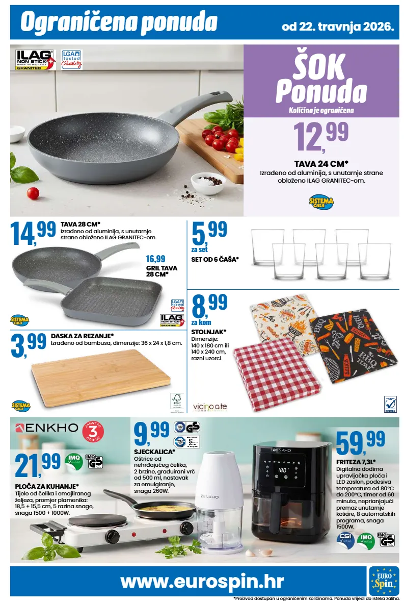 www.eurospin.hr ograničena ponuda *proizvod dostupan u ograničenim količinama. ponuda vrijedi do isteka zaliha. od 22. travnja 2026. tava 28 cm* izrađeno od aluminija, s unutarnje strane obloženo ilag granitec-om. 14 , 99 16,99 gril tava 28 cm* daska za rezanje* izrađeno od bambusa, dimenzije: 36 x 24 x 1,8 cm. 3 , 99 5 , 99 za set set od 6 čaša* tava 24 cm* izrađeno od aluminija, s unutarnje strane obloženo ilag granitec-om. 12 , 99 friteza 7,3l* digitalna dodirna upravljačka ploča i led zaslon, podesiva temperatura od 80°c do 200°c, timer od 60 minuta, neprianjajući premaz unutarnje košare, 8 automatskih programa, snaga 1500w. 59 , 99 ploča za kuhanje* tijelo od čelika i emajliranog željeza, promjer plamenika: 18,5 + 15,5 cm, 5 razina snage, snaga 1500 + 1000w. 21 , 99 sjeckalica* oštrice od nehrđajućeg čelika, 2 brzine, graduirani vrč od 500 ml, nastavak za emulgiranje, snaga 260w. 9 , 99 stolnjak* dimenzije: 140 x 180 cm ili 140 x 240 cm, razni uzorci. 8 , 99 za kom