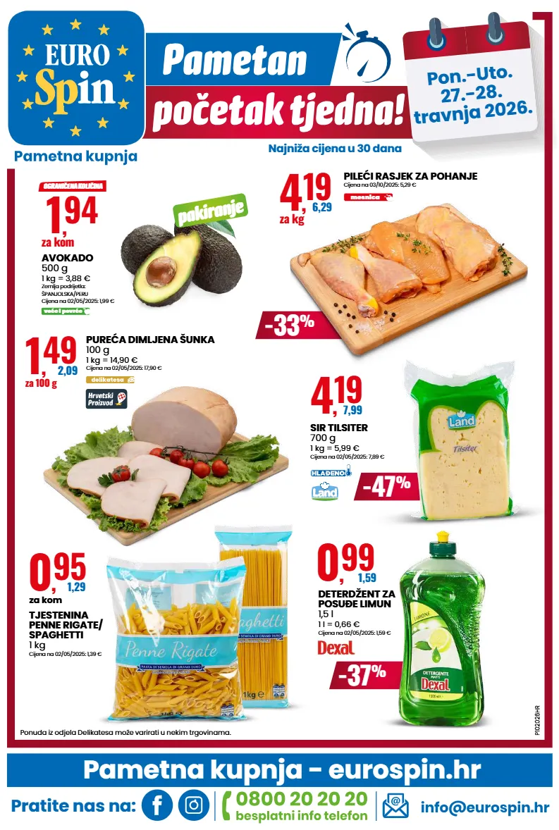 pametna kupnja - eurospin.hr pratite nas na: pon.-uto. 27.-28. travnja 2026. najniža cijena u 30 dana ponuda iz odjela delikatesa može varirati u nekim trgovinama. p102026hr -33 % pileći rasjek za pohanje cijena na 03/10/2025: 5,29 € 4 , 19 6,29 za kg mesnica -47 % 4 , 19 7,99 sir tilsiter 700 g 1 kg = 5,99 € cijena na 02/05/2025: 7,89 € 0 , 95 1,29 za kom tjestenina penne rigate/ spaghetti 1 kg cijena na 02/05/2025: 1,39 € -37 % 0 , 99 1,59 deterdžent za posuðe limun 1,5 l 1 l = 0,66 € cijena na 02/05/2025: 1,59 € pureća dimljena šunka 100 g 1 kg = 14,90 € cijena na 02/05/2025: 17,90 € 1 , 49 2,09 za 100 g avokado 500 g 1 kg = 3,88 € zemlja podrijetla: španjolska/peru cijena na 02/05/2025: 1,99 € pakiranje 1 , 94 za kom voće i povrće ograničena količina