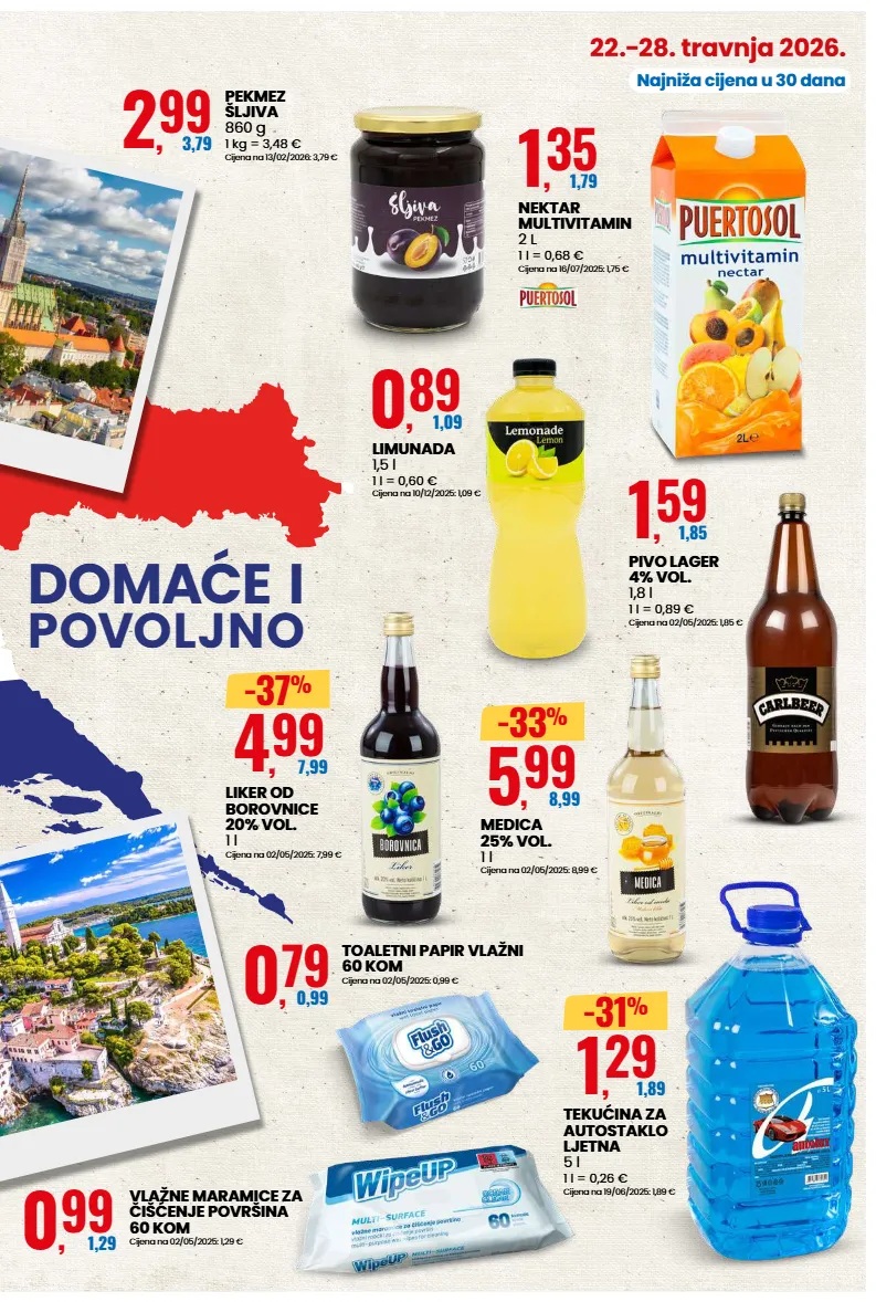 22.-28. travnja 2026. najniža cijena u 30 dana domaće i povoljno 1 , 35 1,79 nektar multivitamin 2 l 1 l = 0,68 € cijena na 16/07/2025: 1,75 € 0 , 89 1,09 limunada 1,5 l 1 l = 0,60 € cijena na 10/12/2025: 1,09 € 1 , 59 1,85 pivo lager 4% vol. 1,8 l 1 l = 0,89 € cijena na 02/05/2025: 1,85 € 4 , 99 7,99 -37 % liker od borovnice 20% vol. 1 l cijena na 02/05/2025: 7,99 € 5 , 99 8,99 -33 % medica 25% vol. 1 l cijena na 02/05/2025: 8,99 € 0 , 79 0,99 toaletni papir vlažni 60 kom cijena na 02/05/2025: 0,99 € 0 , 99 1,29 vlažne maramice za čišćenje površina 60 kom cijena na 02/05/2025: 1,29 € 1 , 29 1,89 -31 % tekućina za autostaklo ljetna 5 l 1 l = 0,26 € cijena na 19/06/2025: 1,89 € 2 , 99 3,79 pekmez šljiva 860 g 1 kg = 3,48 € cijena na 13/02/2026: 3,79 €