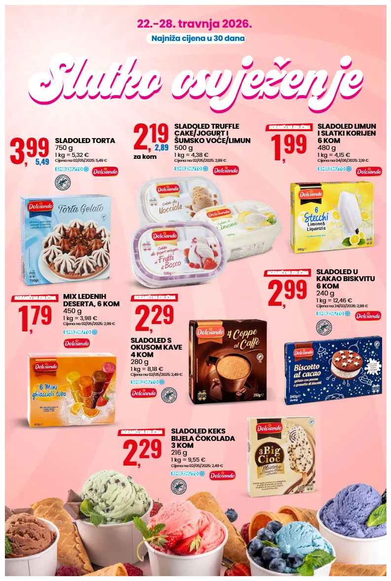 22.-28. travnja 2026. najniža cijena u 30 dana 3 , 99 5,49 sladoled torta 750 g 1 kg = 5,32 € cijena na 02/05/2025: 5,49 € 2 , 19 2,89 za kom sladoled truffle cake/jogurt i šumsko voće/limun 500 g 1 kg = 4,38 € cijena na 02/05/2025: 2,89 € 1 , 99 ograničena količina sladoled limun i slatki korijen 6 kom 480 g 1 kg = 4,15 € cijena na 04/06/2025: 2,19 € 1 , 79 ograničena količina mix ledenih deserta, 6 kom 450 g 1 kg = 3,98 € cijena na 02/05/2025: 2,99 € 2 , 29 ograničena količina sladoled s okusom kave 4 kom 280 g 1 kg = 8,18 € cijena na 02/05/2025: 2,49 € 2 , 99 ograničena količina sladoled u kakao biskvitu 6 kom 240 g 1 kg = 12,46 € cijena na 24/03/2026: 2,99 € 2 , 29 ograničena količina sladoled keks bijela čokolada 3 kom 216 g 1 kg = 9,55 € cijena na 02/05/2025: 2,49 €