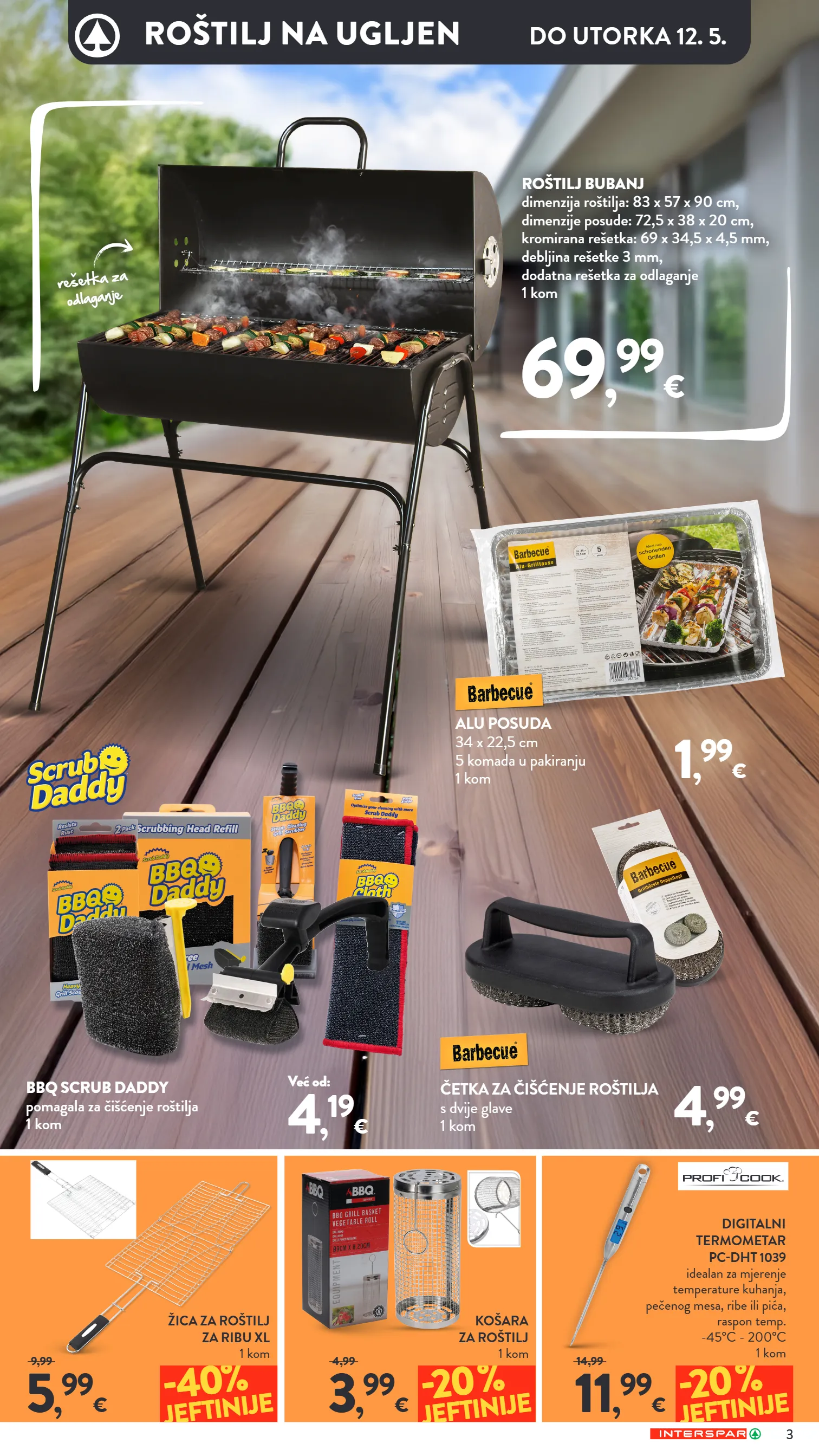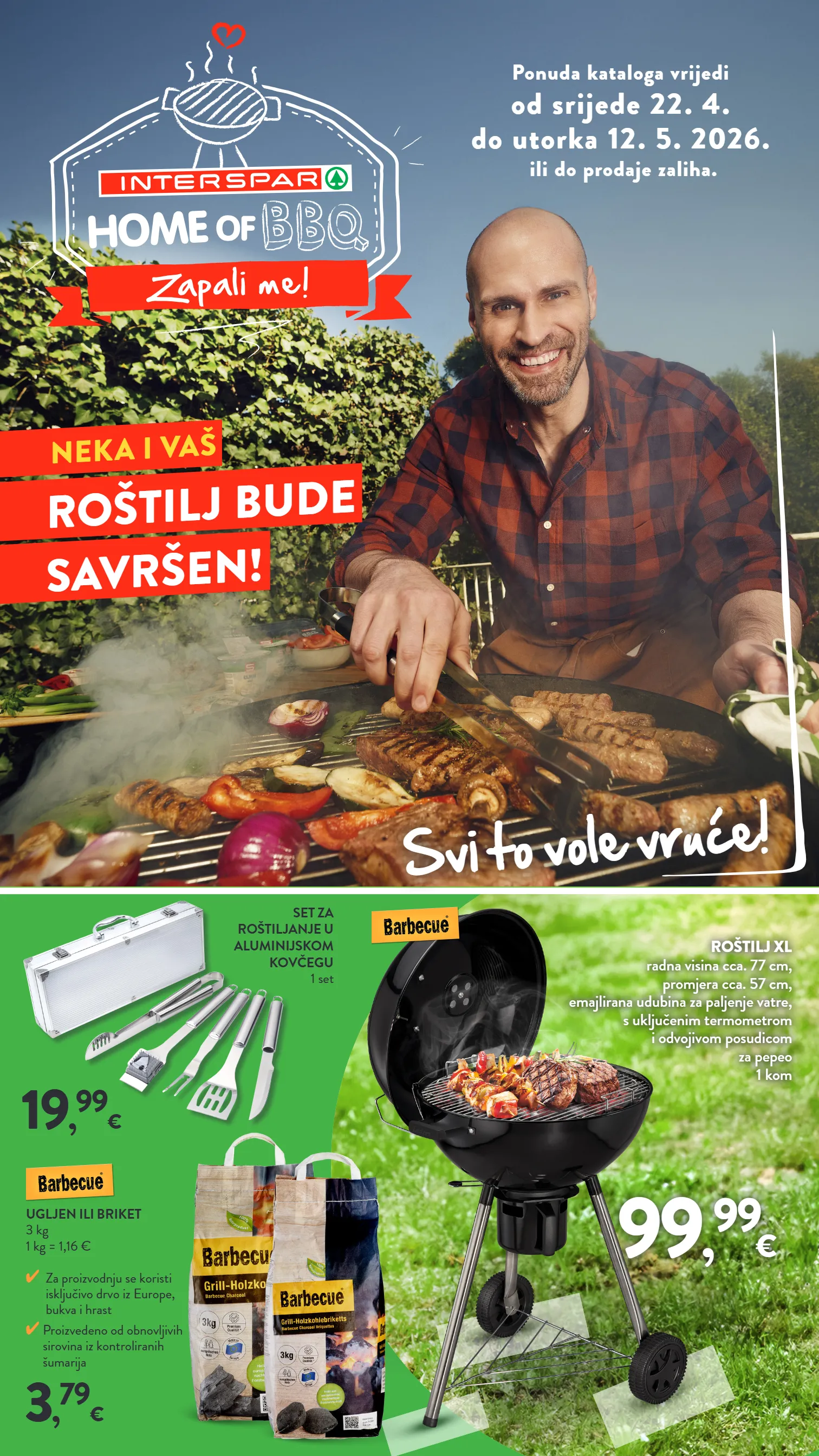 ROŠTILJ XL radna visina cca. 77 cm, promjera cca. 57 cm, emajlirana udubina za paljenje vatre, s uključenim termometrom i odvojivom posudicom za pepeo 1 kom 99 , 99 € UGLJEN ILI BRIKET 3 kg 1 kg = 1,16 € ✔ Za proizvodnju se koristi isključivo drvo iz Europe, bukva i hrast ✔ Proizvedeno od obnovljivih sirovina iz kontroliranih šumarija SET ZA ROŠTILJANJE U ALUMINIJSKOM KOVČEGU 1 set 3 , 79 € RO Š TILJ BUDE SAVR Š EN! 19 , 99 € Ponuda kataloga vrijedi od srijede 22. 4. do utorka 12. 5. 2026. ili do prodaje zaliha. NEKA I VA Š Svi to vole vruće! Svi to vole vruće!
