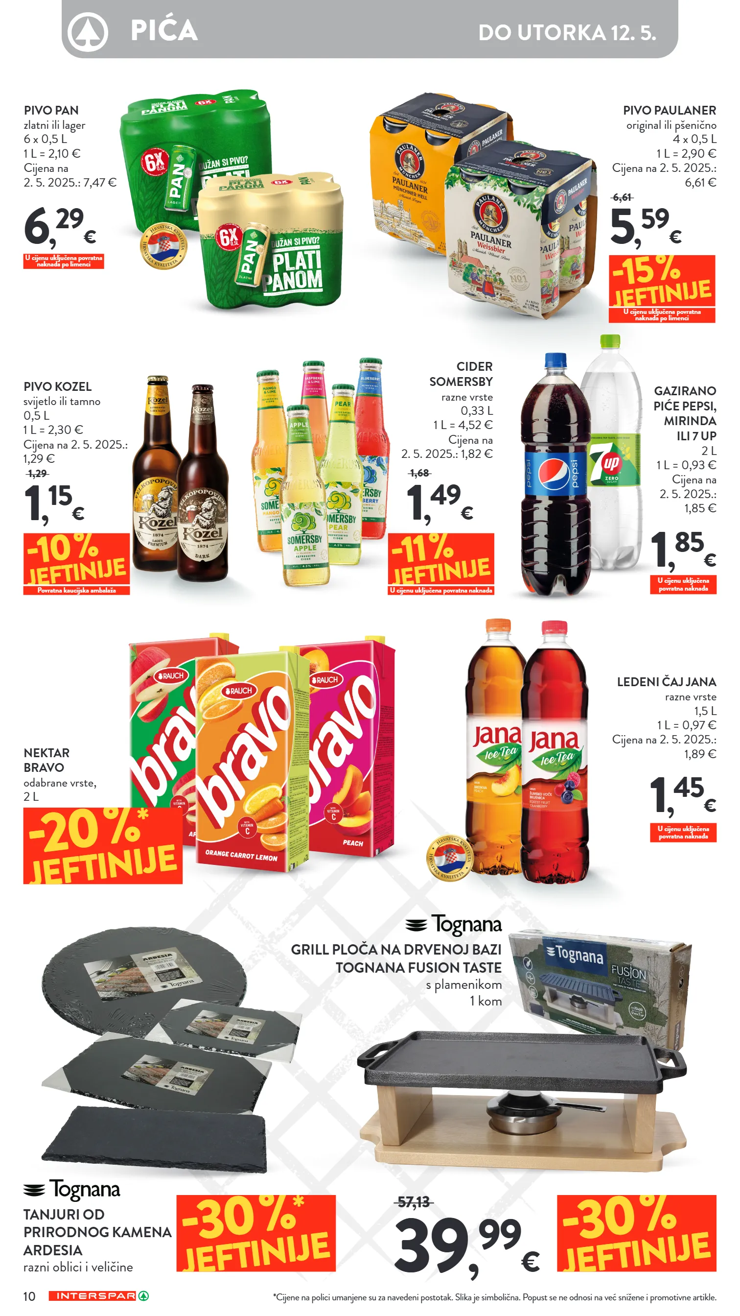 *cijene na polici umanjene su za navedeni postotak. slika je simbolična. popust se ne odnosi na već snižene i promotivne artikle. -30 % * jeftinije -20 % * jeftinije 39 , 99 € 57,13 -30 % jeftinije tanjuri od prirodnog kamena ardesia razni oblici i veličine pivo kozel svijetlo ili tamno 0,5 l 1 l = 2,30 € cijena na 2. 5. 2025.: 1,29 € 1 , 15 € 1,29 u cijenu uključena povratna naknada u cijenu uključena povratna naknada -11 % jeftinije u cijenu uključena povratna naknada -10 % jeftinije povratna kaucijska ambalaža pivo paulaner original ili pšenično 4 x 0,5 l 1 l = 2,90 € cijena na 2. 5. 2025.: 6,61 € ledeni čaj jana razne vrste 1,5 l 1 l = 0,97 € cijena na 2. 5. 2025.: 1,89 € pivo pan zlatni ili lager 6 x 0,5 l 1 l = 2,10 € cijena na 2. 5. 2025.: 7,47 € cider somersby razne vrste 0,33 l 1 l = 4,52 € cijena na 2. 5. 2025.: 1,82 € nektar bravo odabrane vrste, 2 l 5 , 59 € 6,61 1 , 45 € 1 , 85 € 6 , 29 € 1 , 49 € 1,68 -15 % jeftinije u cijenu uključena povratna naknada po limenci u cijenu uključena povratna naknada po limenci grill ploča na drvenoj bazi tognana fusion taste s plamenikom 1 kom gazirano piće pepsi, mirinda ili 7 up 2 l 1 l = 0,93 € cijena na 2. 5. 2025.: 1,85 € 10 pića do utorka 12. 5.