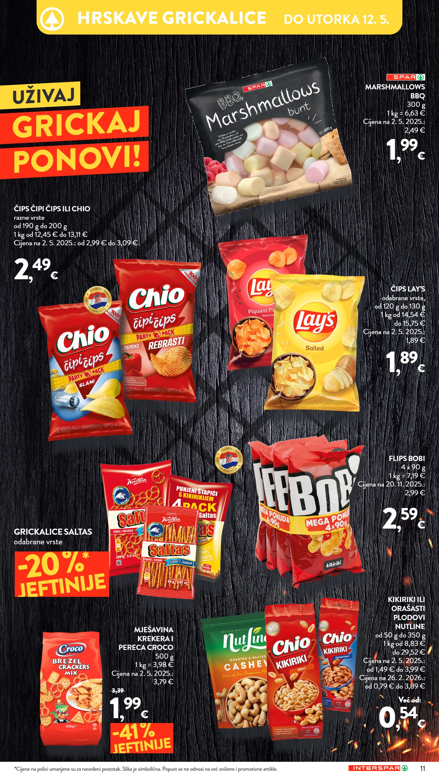 *cijene na polici umanjene su za navedeni postotak. slika je simbolična. popust se ne odnosi na već snižene i promotivne artikle. -20 % * jeftinije marshmallows bbq 300 g 1 kg = 6,63 € cijena na 2. 5. 2025.: 2,49 € 1 , 99 € čips lay’s odabrane vrste, od 120 g do 130 g 1 kg od 14,54 € do 15,75 € cijena na 2. 5. 2025.: 1,89 € 1 , 89 € flips bobi 4 x 90 g 1 kg = 7,19 € cijena na 20. 11. 2025.: 2,99 € 2 , 59 € čips čipi čips ili chio razne vrste od 190 g do 200 g 1 kg od 12,45 € do 13,11 € cijena na 2. 5. 2025.: od 2,99 € do 3,09 € 2 , 49 € kikiriki ili orašasti plodovi nutline od 50 g do 350 g 1 kg od 8,83 € do 29,52 € cijena na 2. 5. 2025.: od 1,49 € do 3,99 € cijena na 26. 2. 2026.: od 0,79 € do 3,89 € mješavina krekera i pereca croco 500 g 1 kg = 3,98 € cijena na 2. 5. 2025.: 3,79 € 1 , 99 € 3,39 -41 % jeftinije uživaj grickaj ponovi! 0 , 54 € već od: grickalice saltas odabrane vrste 11 hrskave grickalice do utorka 12. 5.