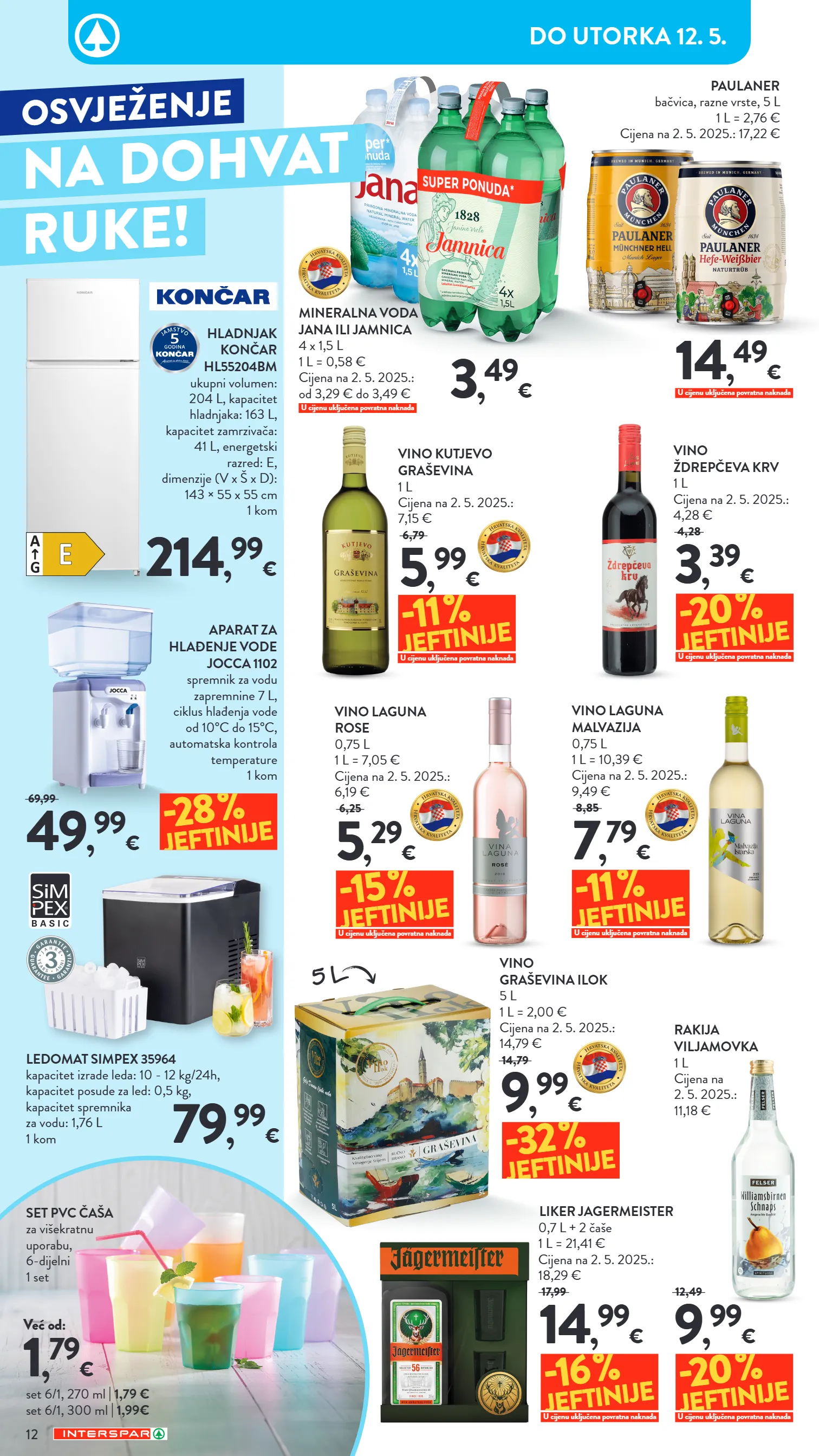 1 , 79 € već od: aparat za hlađenje vode jocca 1102 spremnik za vodu zapremnine 7 l, ciklus hlađenja vode od 10°c do 15°c, automatska kontrola temperature 1 kom hladnjak končar hl55204bm ukupni volumen: 204 l, kapacitet hladnjaka: 163 l, kapacitet zamrzivača: 41 l, energetski razred: e, dimenzije (v x š x d): 143 × 55 x 55 cm 1 kom set pvc čaša za višekratnu uporabu, 6-dijelni 1 set set 6/1, 270 ml | 1,79 € set 6/1, 300 ml | 1,99€ 3 , 49 € 214 , 99 € 49 , 99 € 69,99 -28 % jeftinije ledomat simpex 35964 kapacitet izrade leda: 10 - 12 kg/24h, kapacitet posude za led: 0,5 kg, kapacitet spremnika za vodu: 1,76 l 1 kom 79 , 99 € vino laguna rose 0,75 l 1 l = 7,05 € cijena na 2. 5. 2025.: 6,19 € vino ždrepčeva krv 1 l cijena na 2. 5. 2025.: 4,28 € vino graševina ilok 5 l 1 l = 2,00 € cijena na 2. 5. 2025.: 14,79 € rakija viljamovka 1 l cijena na 2. 5. 2025.: 11,18 € liker jagermeister 0,7 l + 2 čaše 1 l = 21,41 € cijena na 2. 5. 2025.: 18,29 € vino kutjevo graševina 1 l cijena na 2. 5. 2025.: 7,15 € vino laguna malvazija 0,75 l 1 l = 10,39 € cijena na 2. 5. 2025.: 9,49 € mineralna voda jana ili jamnica 4 x 1,5 l 1 l = 0,58 € cijena na 2. 5. 2025.: od 3,29 € do 3,49 € 5 , 29 € 6,25 3 , 39 € 4,28 9 , 99 € 14,79 14 , 99 € 17,99 9 , 99 € 12,49 5 , 99 € 6,79 7 , 79 € 8,85 -11 % jeftinije u cijenu uključena povratna naknada u cijenu uključena povratna naknada -20 % jeftinije u cijenu uključena povratna naknada -32 % jeftinije -15 % jeftinije u cijenu uključena povratna naknada -11 % jeftinije u cijenu uključena povratna naknada -16 % jeftinije u cijenu uključena povratna naknada -20 % jeftinije u cijenu uključena povratna naknada 5 l u cijenu uključena povratna naknada paulaner bačvica, razne vrste, 5 l 1 l = 2,76 € cijena na 2. 5. 2025.: 17,22 € 14 , 49 € 12 do utorka 12. 5. osvježenje na dohvat ruke!