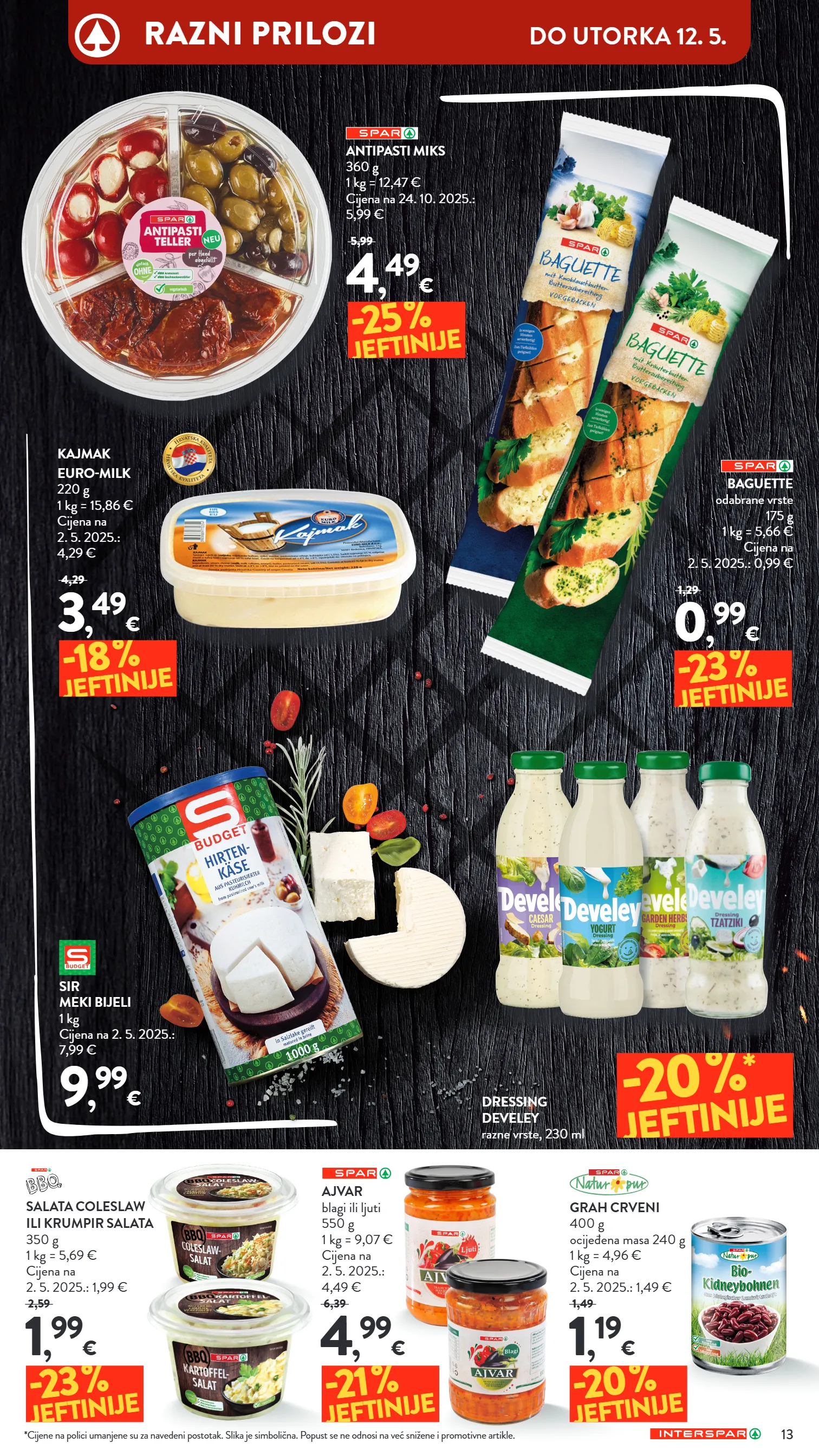-20 % * jeftinije baguette odabrane vrste 175 g 1 kg = 5,66 € cijena na 2. 5. 2025.: 0,99 € antipasti miks 360 g 1 kg = 12,47 € cijena na 24. 10. 2025.: 5,99 € kajmak euro-milk 220 g 1 kg = 15,86 € cijena na 2. 5. 2025.: 4,29 € dressing develey razne vrste, 230 ml sir meki bijeli 1 kg cijena na 2. 5. 2025.: 7,99 € 0 , 99 € 1,29 4 , 49 € 5,99 3 , 49 € 4,29 9 , 99 € -23 % jeftinije -25 % jeftinije -18 % jeftinije salata coleslaw ili krumpir salata 350 g 1 kg = 5,69 € cijena na 2. 5. 2025.: 1,99 € ajvar blagi ili ljuti 550 g 1 kg = 9,07 € cijena na 2. 5. 2025.: 4,49 € grah crveni 400 g ocijeđena masa 240 g 1 kg = 4,96 € cijena na 2. 5. 2025.: 1,49 € 1 , 99 € 2,59 4 , 99 € 6,39 1 , 19 € 1,49 -23 % jeftinije -21 % jeftinije -20 % jeftinije *cijene na polici umanjene su za navedeni postotak. slika je simbolična. popust se ne odnosi na već snižene i promotivne artikle. 13 razni prilozi do utorka 12. 5.
