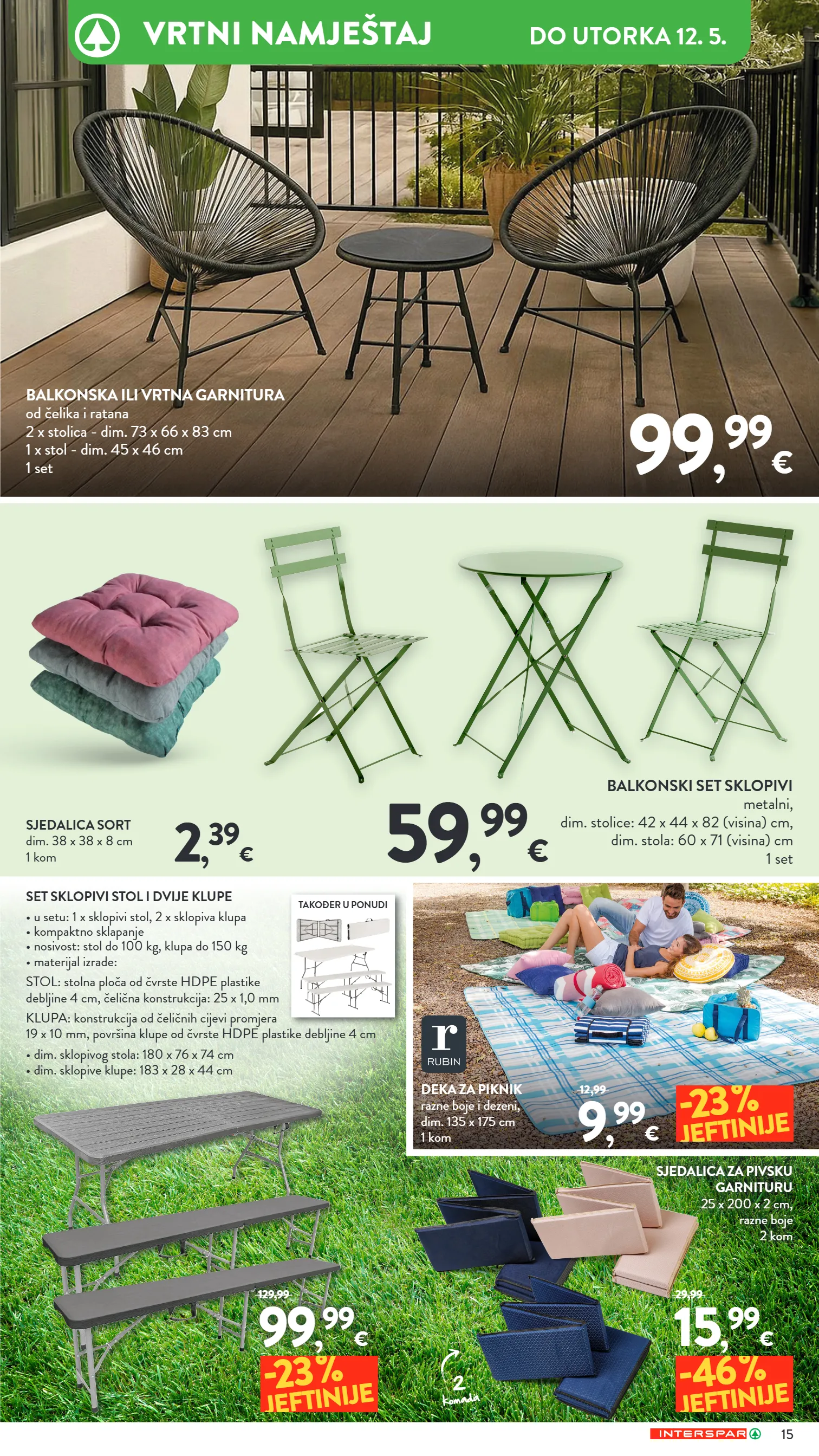 balkonski set sklopivi metalni, dim. stolice: 42 x 44 x 82 (visina) cm, dim. stola: 60 x 71 (visina) cm 1 set 59 , 99 € 99 , 99 € sjedalica sort dim. 38 x 38 x 8 cm 1 kom set sklopivi stol i dvije klupe • u setu: 1 x sklopivi stol, 2 x sklopiva klupa • kompaktno sklapanje • nosivost: stol do 100 kg, klupa do 150 kg • materijal izrade: stol: stolna ploča od čvrste hdpe plastike debljine 4 cm, čelična konstrukcija: 25 x 1,0 mm klupa: konstrukcija od čeličnih cijevi promjera 19 x 10 mm, površina klupe od čvrste hdpe plastike debljine 4 cm • dim. sklopivog stola: 180 x 76 x 74 cm • dim. sklopive klupe: 183 x 28 x 44 cm 2 , 39 € sjedalica za pivsku garnituru 25 x 200 x 2 cm, razne boje 2 kom balkonska ili vrtna garnitura od čelika i ratana 2 x stolica - dim. 73 x 66 x 83 cm 1 x stol - dim. 45 x 46 cm 1 set 15 , 99 € 29,99 -46 % jeftinije 99 , 99 € 129,99 -23 % jeftinije 2 komada 9 , 99 € 12,99 -23 % jeftinije deka za piknik razne boje i dezeni, dim. 135 x 175 cm 1 kom također u ponudi 15 vrtni namještaj do utorka 12. 5.