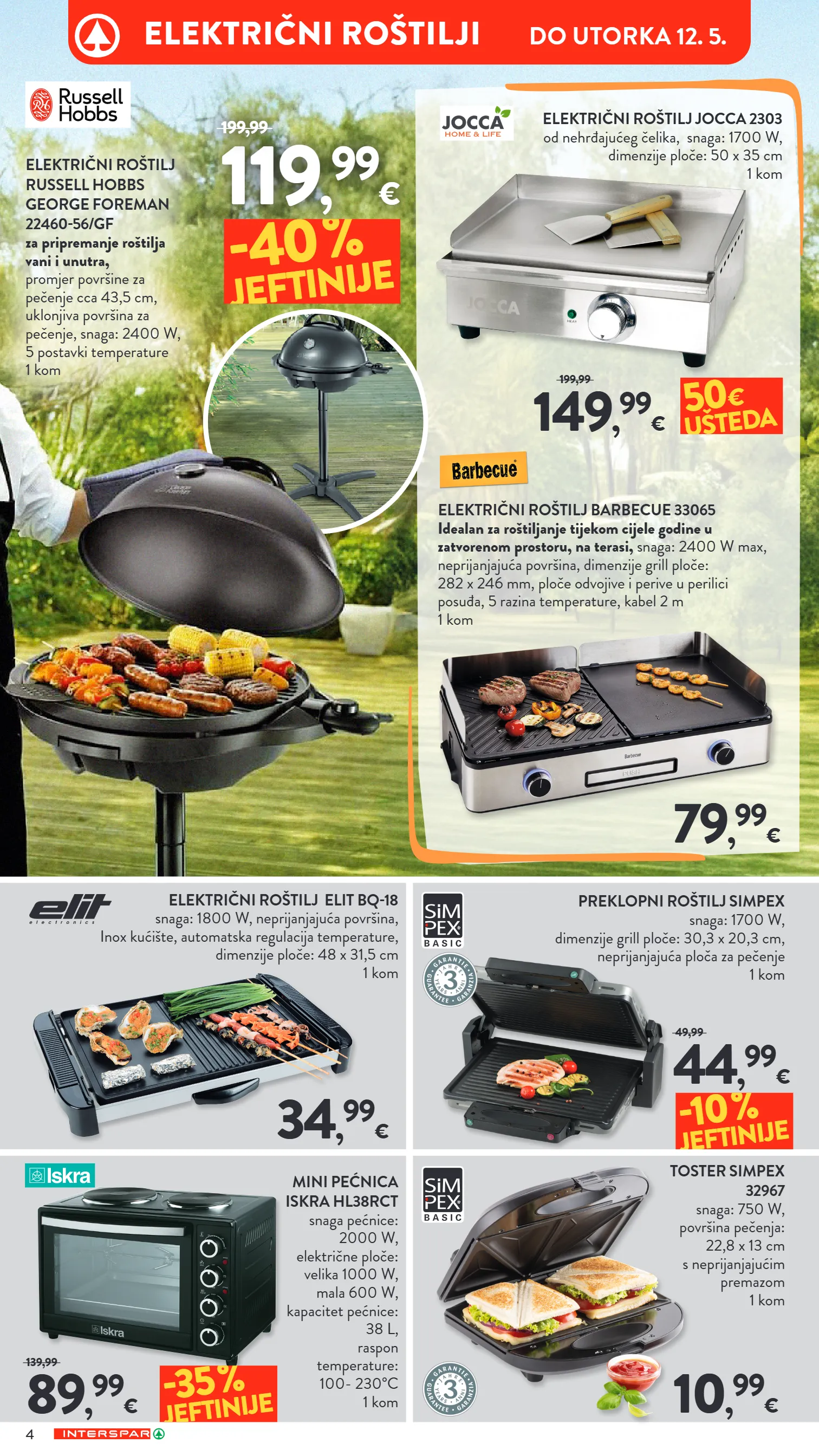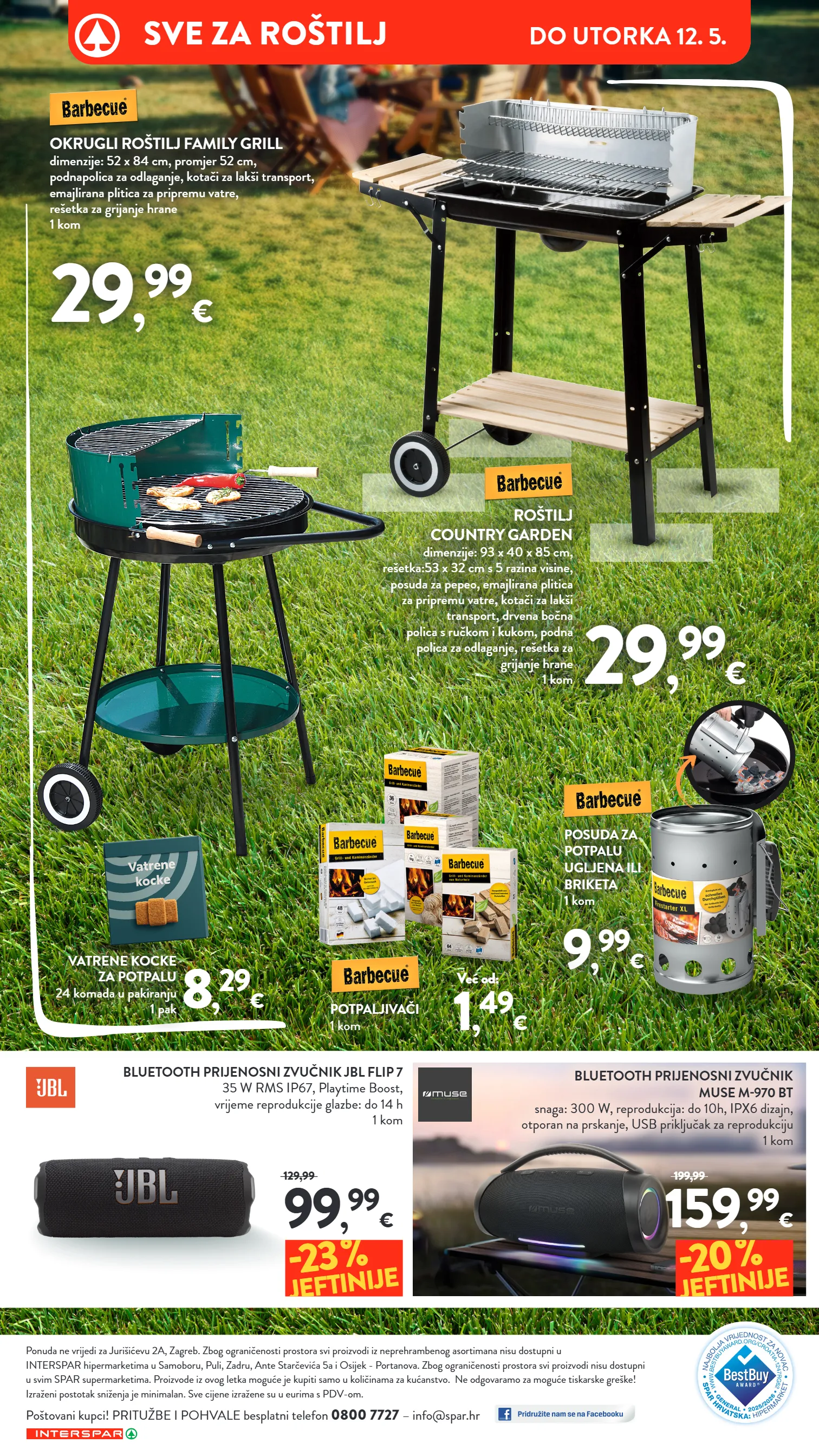 bluetooth prijenosni zvučnik muse m-970 bt snaga: 300 w, reprodukcija: do 10h, ipx6 dizajn, otporan na prskanje, usb priključak za reprodukciju 1 kom bluetooth prijenosni zvučnik jbl flip 7 35 w rms ip67, playtime boost, vrijeme reprodukcije glazbe: do 14 h 1 kom 99 , 99 € 129,99 -23 % jeftinije 159 , 99 € 199,99 -20 % jeftinije 29 , 99 € 29 , 99 € posuda za potpalu ugljena ili briketa 1 kom 9 , 99 € ponuda ne vrijedi za jurišićevu 2a, zagreb. zbog ograničenosti prostora svi proizvodi iz neprehrambenog asortimana nisu dostupni u interspar hipermarketima u samoboru, puli, zadru, ante starčevića 5a i osijek - portanova. zbog ograničenosti prostora svi proizvodi nisu dostupni u svim spar supermarketima. proizvode iz ovog letka moguće je kupiti samo u količinama za kućanstvo. ne odgovaramo za moguće tiskarske greške! izraženi postotak sniženja je minimalan. sve cijene izražene su u eurima s pdv-om. poštovani kupci! pritužbe i pohvale besplatni telefon 0800 7727 – info@spar.hr roštilj country garden dimenzije: 93 x 40 x 85 cm, rešetka:53 x 32 cm s 5 razina visine, posuda za pepeo, emajlirana plitica za pripremu vatre, kotači za lakši transport, drvena bočna polica s ručkom i kukom, podna polica za odlaganje, rešetka za grijanje hrane 1 kom okrugli roštilj family grill dimenzije: 52 x 84 cm, promjer 52 cm, podnapolica za odlaganje, kotači za lakši transport, emajlirana plitica za pripremu vatre, rešetka za grijanje hrane 1 kom potpaljivači 1 kom vatrene kocke za potpalu 24 komada u pakiranju 1 pak 1 , 49 € već od: 8 , 29 € text do utorka 17. 3. sve za ro š tilj do utorka 12. 5.