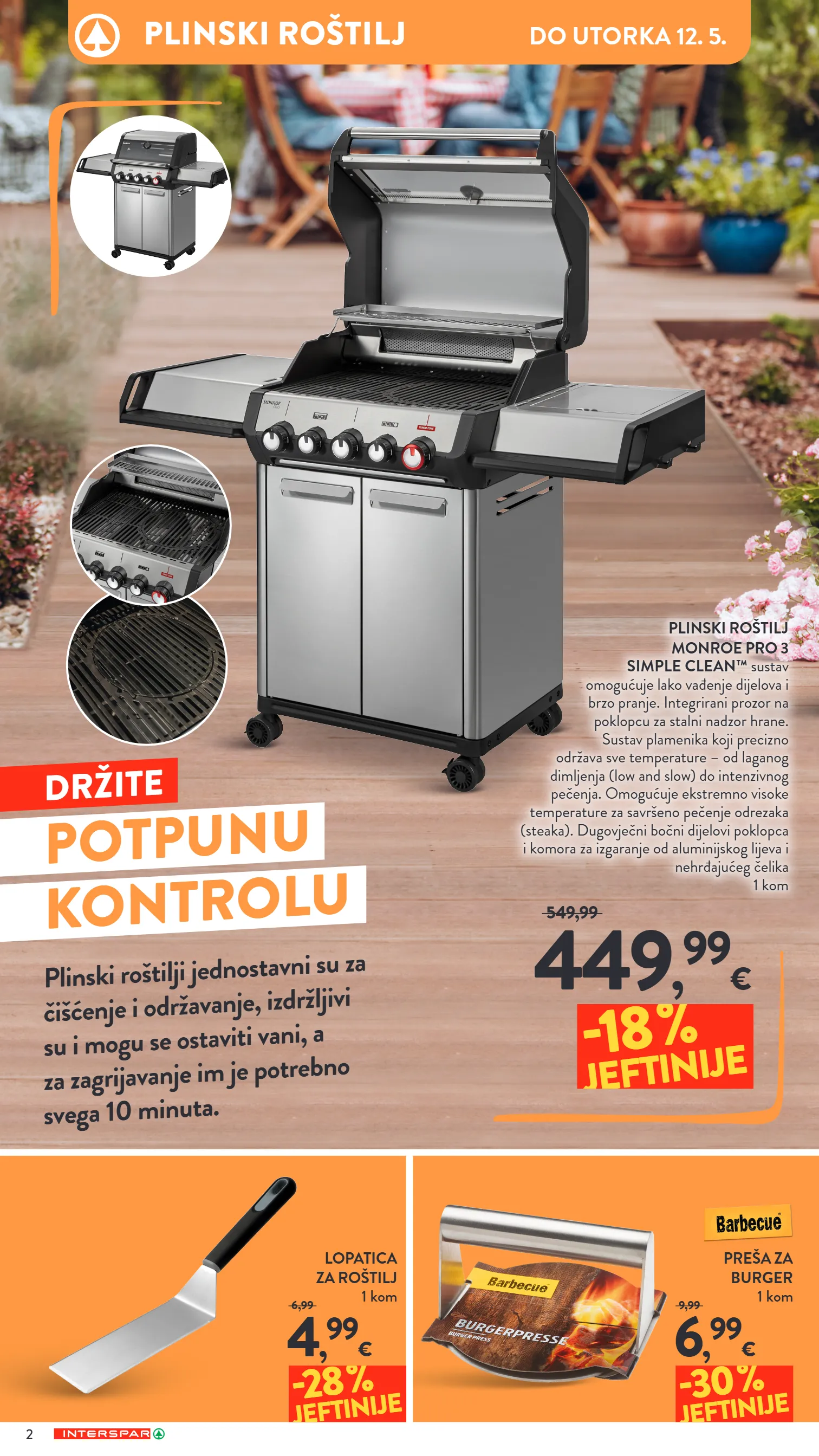 2 plinski roštilj do utorka 12. 5. plinski roštilj monroe pro 3 simple clean™ sustav omogućuje lako vađenje dijelova i brzo pranje. integrirani prozor na poklopcu za stalni nadzor hrane. sustav plamenika koji precizno održava sve temperature – od laganog dimljenja (low and slow) do intenzivnog pečenja. omogućuje ekstremno visoke temperature za savršeno pečenje odrezaka (steaka). dugovječni bočni dijelovi poklopca i komora za izgaranje od aluminijskog lijeva i nehrđajućeg čelika 1 kom 449 , 99 € 549,99 -18 % jeftinije preša za burger 1 kom 6 , 99 € 9,99 -30 % jeftinije lopatica za roštilj 1 kom 4 , 99 € 6,99 -28 % jeftinije držite potpunu kontrolu plinski roštilji jednostavni su za čišćenje i održavanje, izdržljivi su i mogu se ostaviti vani, a za zagrijavanje im je potrebno svega 10 minuta.