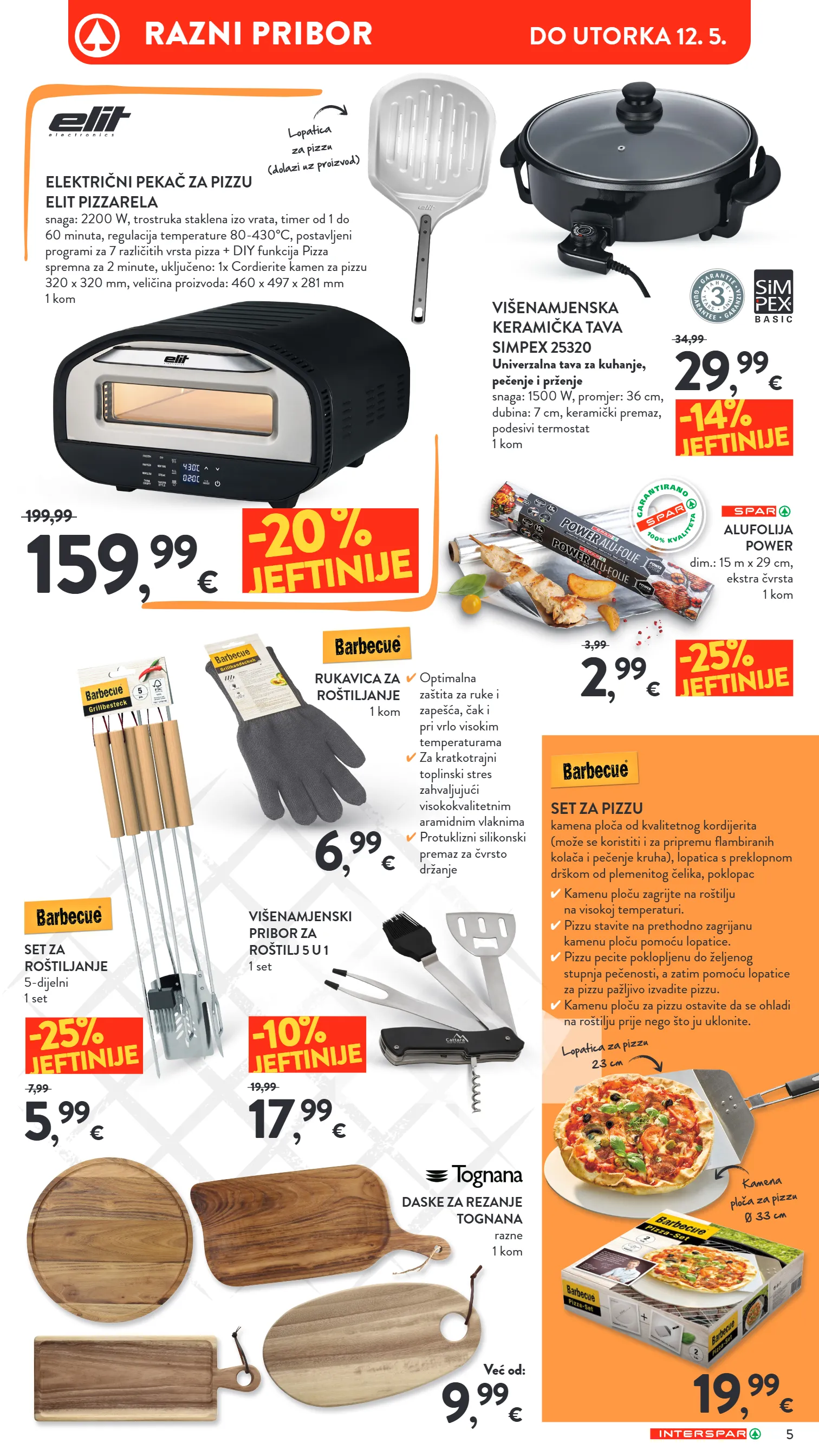 19 , 99 € 9 , 99 € već od: 159 , 99 € 199,99 -20 % jeftinije set za pizzu kamena ploča od kvalitetnog kordijerita (može se koristiti i za pripremu flambiranih kolača i pečenje kruha), lopatica s preklopnom drškom od plemenitog čelika, poklopac ✔ kamenu ploču zagrijte na roštilju na visokoj temperaturi. ✔ pizzu stavite na prethodno zagrijanu kamenu ploču pomoću lopatice. ✔ pizzu pecite poklopljenu do željenog stupnja pečenosti, a zatim pomoću lopatice za pizzu pažljivo izvadite pizzu. ✔ kamenu ploču za pizzu ostavite da se ohladi na roštilju prije nego što ju uklonite. 29 , 99 € 34,99 2 , 99 € 3,99 5 , 99 € 7,99 17 , 99 € 19,99 6 , 99 € -14% jeftinije -25% jeftinije -25% jeftinije -10% jeftinije električni pekač za pizzu elit pizzarela snaga: 2200 w, trostruka staklena izo vrata, timer od 1 do 60 minuta, regulacija temperature 80-430°c, postavljeni programi za 7 različitih vrsta pizza + diy funkcija pizza spremna za 2 minute, uključeno: 1x cordierite kamen za pizzu 320 x 320 mm, veličina proizvoda: 460 x 497 x 281 mm 1 kom višenamjenska keramička tava simpex 25320 univerzalna tava za kuhanje, pečenje i prženje snaga: 1500 w, promjer: 36 cm, dubina: 7 cm, keramički premaz, podesivi termostat 1 kom alufolija power dim.: 15 m x 29 cm, ekstra čvrsta 1 kom set za roštiljanje 5-dijelni 1 set višenamjenski pribor za roštilj 5 u 1 1 set daske za rezanje tognana razne 1 kom ✔ optimalna zaštita za ruke i zapešća, čak i pri vrlo visokim temperaturama ✔ za kratkotrajni toplinski stres zahvaljujući visokokvalitetnim aramidnim vlaknima ✔ protuklizni silikonski premaz za čvrsto držanje rukavica za roštiljanje 1 kom lopatica za pizzu 23 cm lopatica za pizzu (dolazi uz proizvod) kamena ploča za pizzu ø 33 cm 5 razni pribor do utorka 12. 5.