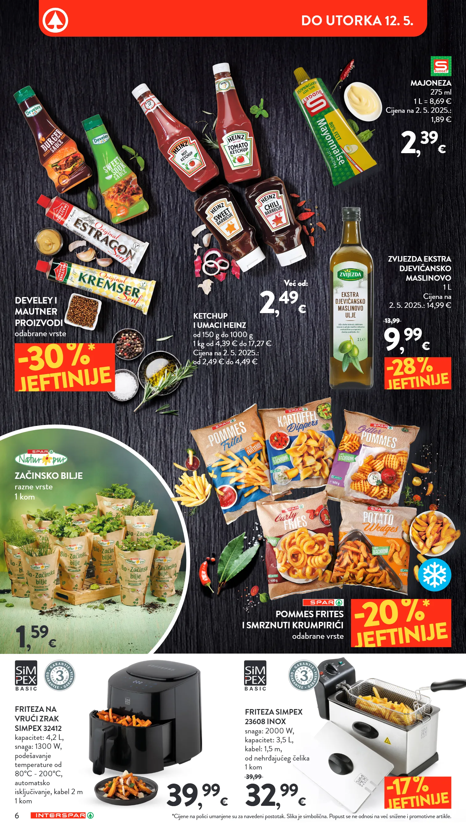 *cijene na polici umanjene su za navedeni postotak. slika je simbolična. popust se ne odnosi na već snižene i promotivne artikle. -20 % * jeftinije -30 % * jeftinije friteza simpex 23608 inox snaga: 2000 w, kapacitet: 3,5 l, kabel: 1,5 m, od nehrđajućeg čelika 1 kom friteza na vrući zrak simpex 32412 kapacitet: 4,2 l, snaga: 1300 w, podešavanje temperature od 80°c - 200°c, automatsko isključivanje, kabel 2 m 1 kom 32 , 99 € 39,99 39 , 99 € -17 % jeftinije 1 , 59 € začinsko bilje razne vrste 1 kom pommes frites i smrznuti krumpirići odabrane vrste develey i mautner proizvodi odabrane vrste ketchup i umaci heinz od 150 g do 1000 g 1 kg od 4,39 € do 17,27 € cijena na 2. 5. 2025.: od 2,49 € do 4,49 € majoneza 275 ml 1 l = 8,69 € cijena na 2. 5. 2025.: 1,89 € zvijezda ekstra djevičansko maslinovo 1 l cijena na 2. 5. 2025.: 14,99 € 2 , 39 € 9 , 99 € 13,99 -28 % jeftinije 2 , 49 € već od: 6 do utorka 12. 5.