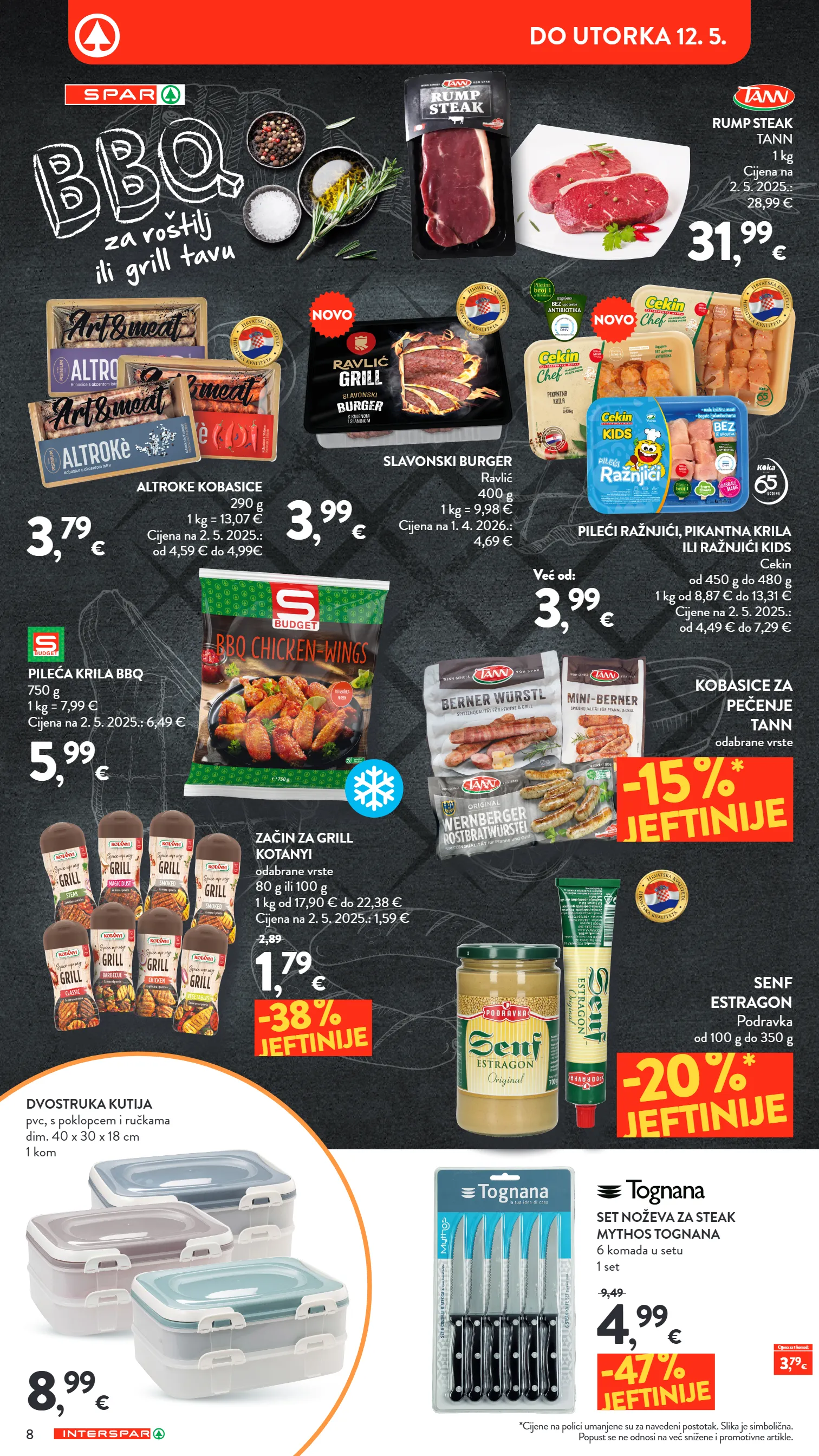 dvostruka kutija pvc, s poklopcem i ručkama dim. 40 x 30 x 18 cm 1 kom set noževa za steak mythos tognana 6 komada u setu 1 set 8 , 99 € 4 , 99 € 9,49 -47 % jeftinije kobasice za pečenje tann odabrane vrste začin za grill kotanyi odabrane vrste 80 g ili 100 g 1 kg od 17,90 € do 22,38 € cijena na 2. 5. 2025.: 1,59 € senf estragon podravka od 100 g do 350 g -15 % * jeftinije -20 % * jeftinije altroke kobasice 290 g 1 kg = 13,07 € cijena na 2. 5. 2025.: od 4,59 € do 4,99€ slavonski burger ravlić 400 g 1 kg = 9,98 € cijena na 1. 4. 2026.: 4,69 € pileći ražnjići, pikantna krila ili ražnjići kids cekin od 450 g do 480 g 1 kg od 8,87 € do 13,31 € cijene na 2. 5. 2025.: od 4,49 € do 7,29 € rump steak tann 1 kg cijena na 2. 5. 2025.: 28,99 € 3 , 79 € 3 , 99 € 31 , 99 € pileća krila bbq 750 g 1 kg = 7,99 € cijena na 2. 5. 2025.: 6,49 € 5 , 99 € 1 , 79 € 2,89 -38 % jeftinije 3 , 99 € već od: *cijene na polici umanjene su za navedeni postotak. slika je simbolična. popust se ne odnosi na već snižene i promotivne artikle. 3 , 79 € cijena za 1 komad: novo novo 8 do utorka 12. 5.