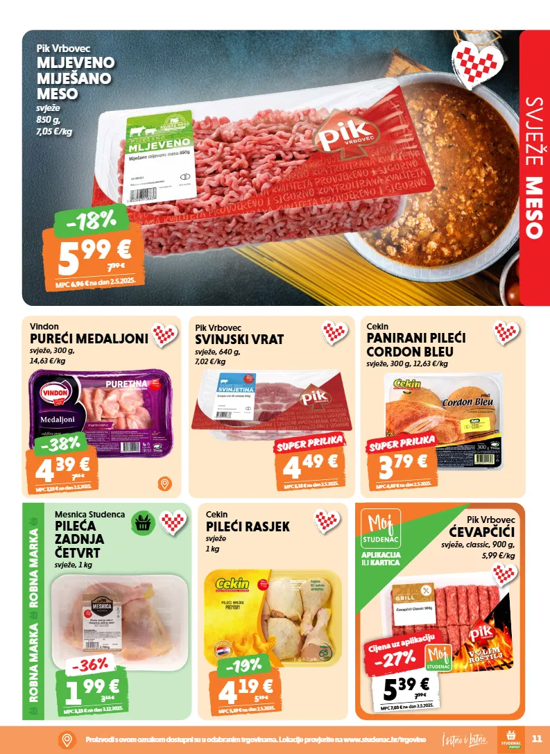 robna marka robna marka -18% 5 99 € mpc 6,96 € na dan 2.5.2025. 7 3 9 € cekin pileći rasjek svježe 1 kg cekin panirani pileći cordon bleu svježe, 300 g, 12,63 €/kg 3 79 € mpc 4,07 € na dan 2.5.2025. super prilika pik vrbovec svinjski vrat svježe, 640 g, 7,02 €/kg 4 49 € mpc 5,15 € na dan 2.5.2025. super prilika pik vrbovec mljeveno miješano meso svježe 850 g, 7,05 €/kg mesnica studenca pileća zadnja četvrt svježe, 1 kg -36% 1 99 € mpc 3,15 € na dan 3.12.2025. 3 1 5 € -19% 4 19 € mpc 5,19 € na dan 2.5.2025. 5 1 9 € vindon pureći medaljoni svježe, 300 g, 14,63 €/kg -38% 4 39 € mpc 7,15 € na dan 2.5.2025. 7 1 5 € 11 svježe meso pik vrbovec ćevapčići svježe, classic, 900 g, 5,99 €/kg 5 , 39 € mpc 7,03 € na dan 2.5.2025. 7 , 3 9 € cijena uz aplikaciju -27% proizvodi s ovom oznakom dostupni su u odabranim trgovinama. lokacije provjerite na www.studenac.hr/trgovine aplikacija ili kartica