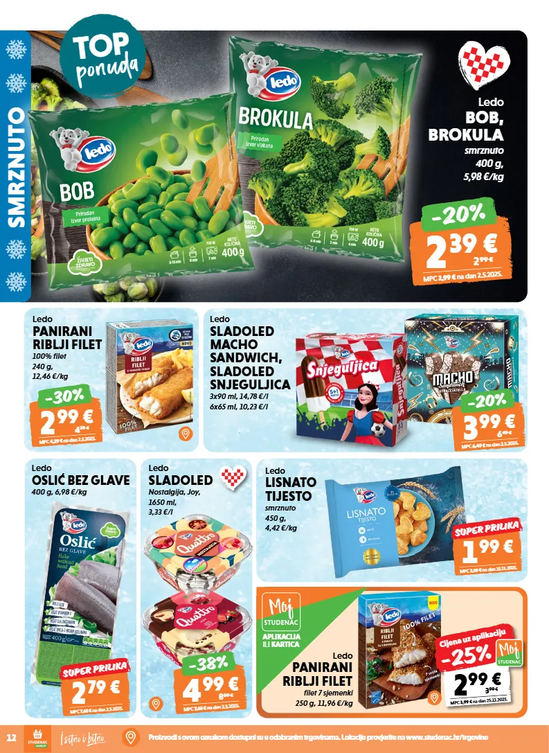 -38% 4 99 € mpc 7,65 € na dan 2.5.2025. 8 0 9 € ledo sladoled nostalgija, joy, 1650 ml, 3,33 €/l ledo sladoled macho sandwich, sladoled snjeguljica 3x90 ml, 14,78 €/l 6x65 ml, 10,23 €/l ledo panirani riblji filet 100% filet 240 g, 12,46 €/kg -30% 2 99 € mpc 4,29 € na dan 2.5.2025. 4 2 9 € -20% 3 99 € mpc 6,49 € na dan 2.5.2025. 6 4 9 € ledo lisnato tijesto smrznuto 450 g, 4,42 €/kg ledo oslić bez glave 400 g, 6,98 €/kg 12 proizvodi s ovom oznakom dostupni su u odabranim trgovinama. lokacije provjerite na www.studenac.hr/trgovine smrznuto top top ponuda ledo bob, brokula smrznuto 400 g, 5,98 €/kg -20% 2 39 € mpc 2,99 € na dan 2.5.2025. 2 9 9 € ledo panirani riblji filet filet 7 sjemenki 250 g, 11,96 €/kg 2 99 € mpc 3,99 € na dan 25.11.2025. 3 99 € cijena uz aplikaciju -25% 1 99 € mpc 2,59 € na dan 25.11.2025. super prilika 2 79 € mpc 7,65 € na dan 2.5.2025. super prilika aplikacija ili kartica