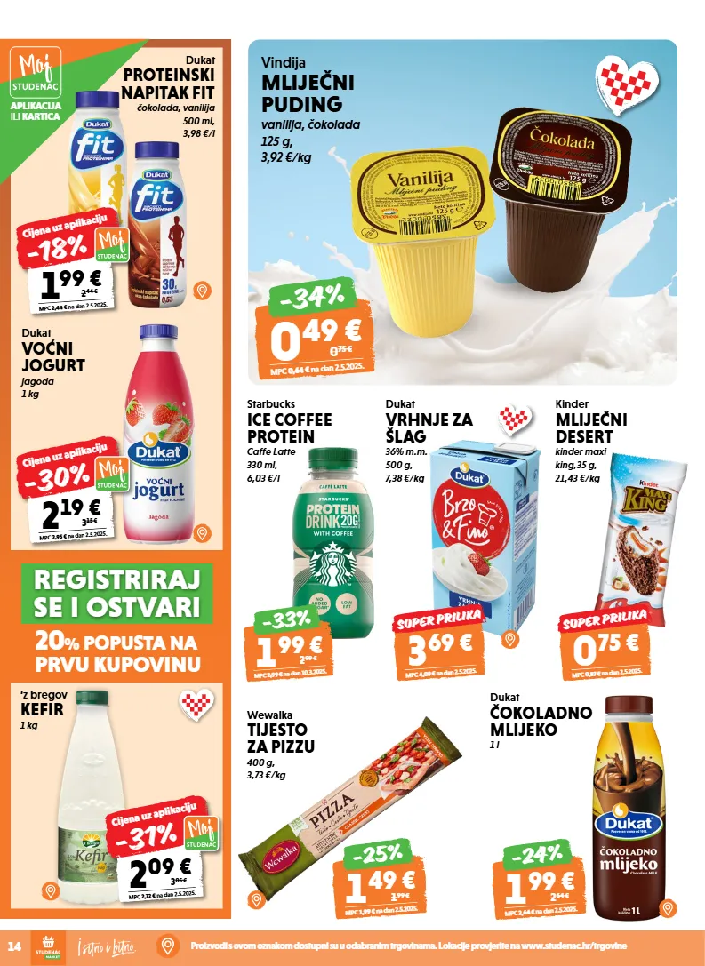 registriraj se i ostvari 20 % popusta na prvu kupovinu 14 proizvodi s ovom oznakom dostupni su u odabranim trgovinama. lokacije provjerite na www.studenac.hr/trgovine vindija mliječni puding vanilija, čokolada 125 g, 3,92 €/kg -34% 0 49 € mpc 0,64 € na dan 2.5.2025. 0 7 5 € dukat čokoladno mlijeko 1 l -24% 1 99 € mpc 2,64 € na dan 2.5.2025. 2 6 4 € starbucks ice coffee protein caffe latte 330 ml, 6,03 €/l wewalka tijesto za pizzu 400 g, 3,73 €/kg -25% 1 49 € mpc 1,99 € na dan 2.5.2025. 1 9 9 € dukat vrhnje za šlag 36% m.m. 500 g, 7,38 €/kg 3 69 € mpc 4,09 € na dan 2.5.2025. super prilika kinder mliječni desert kinder maxi king,35 g, 21,43 €/kg 0 75 € mpc 0,87 € na dan 2.5.2025. super prilika aplikacija ili kartica ‘z bregov kefir 1 kg 2 09 € mpc 2,72 € na dan 2.5.2025. 3 05 € cijena uz aplikaciju -31% dukat proteinski napitak fit čokolada, vanilija 500 ml, 3,98 €/l 1 99 € mpc 2,44 € na dan 2.5.2025. 2 44 € cijena uz aplikaciju -18% dukat voćni jogurt jagoda 1 kg 2 19 € mpc 2,95 € na dan 2.5.2025. 3 15 € cijena uz aplikaciju -30% -33% 1 99 € mpc 2,99 € na dan 10.3.2025. 2 9 9 €