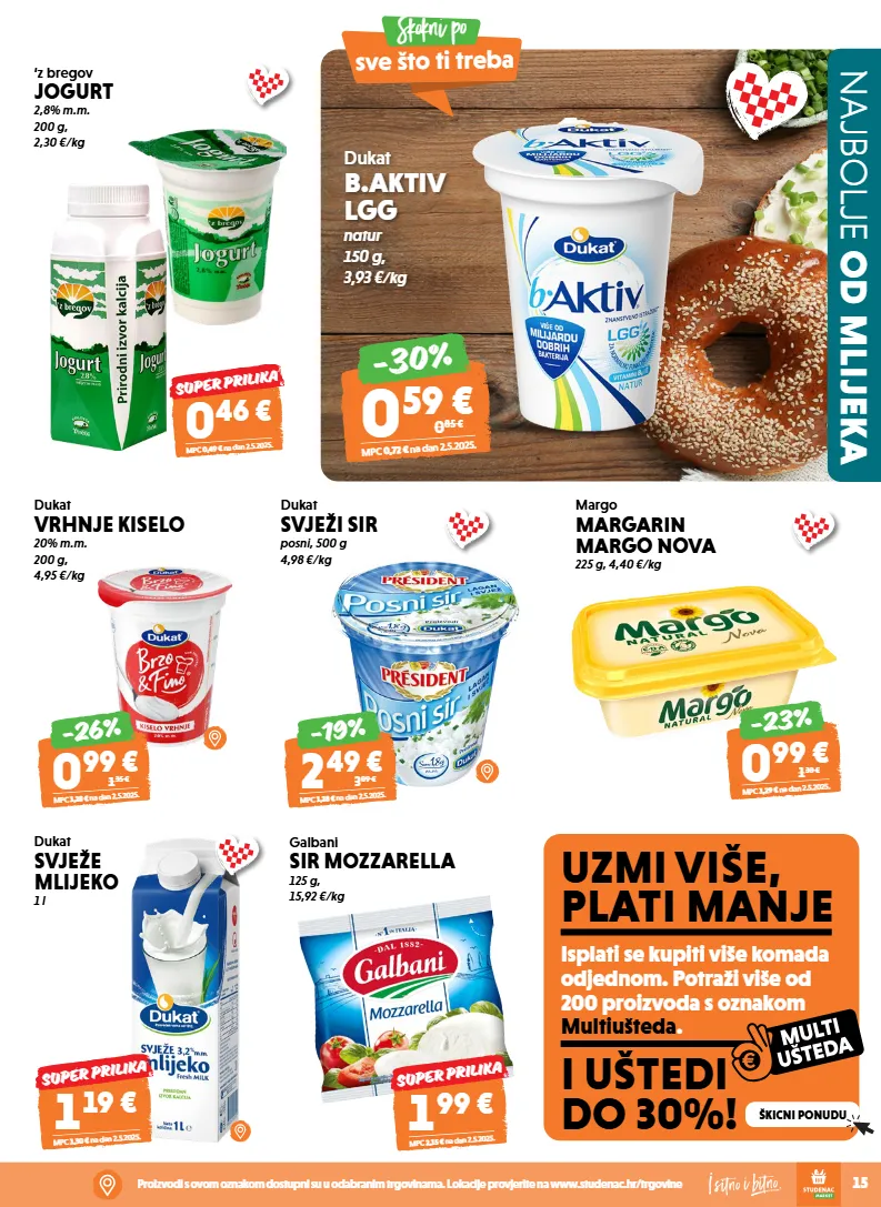 margo margarin margo nova 225 g, 4,40 €/kg 15 skokni po sve što ti treba dukat vrhnje kiselo 20% m.m. 200 g, 4,95 €/kg -26% 0 99 € mpc 1,28 € na dan 2.5.2025. 1 3 5 € dukat svježe mlijeko 1 l 1 19 € mpc 1,30 € na dan 2.5.2025. super prilika dukat svježi sir posni, 500 g 4,98 €/kg galbani sir mozzarella 125 g, 15,92 €/kg proizvodi s ovom oznakom dostupni su u odabranim trgovinama. lokacije provjerite na www.studenac.hr/trgovine uzmi više, plati manje i uštedi do 30%! isplati se kupiti više komada odjednom. potraži više od 200 proizvoda s oznakom multiušteda . škicni ponudu najbolje od mlijeka dukat b.aktiv lgg natur 150 g, 3,93 €/kg -30% 0 59 € mpc 0,72 € na dan 2.5.2025. 0 8 5 € ‘z bregov jogurt 2,8% m.m. 200 g, 2,30 €/kg 0 46 € mpc 0,49 € na dan 2.5.2025. super prilika -19% 2 49 € mpc 1,28 € na dan 2.5.2025. 3 0 9 € -23% 0 99 € mpc 1,29 € na dan 2.5.2025. 1 3 8 € 1 99 € mpc 2,15 € na dan 2.5.2025. super prilika