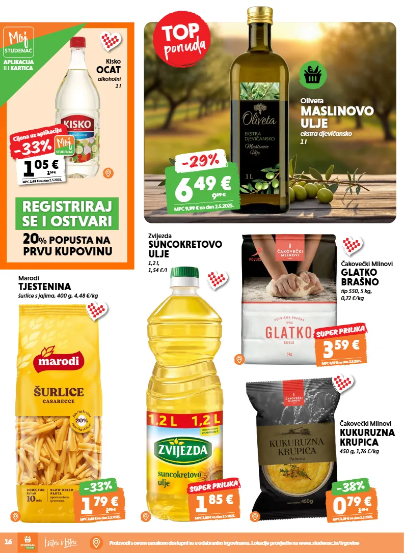 16 proizvodi s ovom oznakom dostupni su u odabranim trgovinama. lokacije provjerite na www.studenac.hr/trgovine -29% 6 49 € mpc 9,99 € na dan 2.5.2025. 9 1 9 € čakovečki mlinovi kukuruzna krupica 450 g, 1,76 €/kg -38% 0 79 € mpc 1,29 € na dan 2.5.2025. 1 2 9 € čakovečki mlinovi glatko brašno tip 550, 5 kg, 0,72 €/kg 3 59 € mpc 3,97 € na dan 2.5.2025. super prilika zvijezda suncokretovo ulje 1,2 l, 1,54 €/l 1 85 € mpc 2,05 € na dan 2.5.2025. super prilika kisko ocat alkoholni 1 l marodi tjestenina šurlice s jajima, 400 g, 4,48 €/kg -33% 1 79 € mpc 2,65 € na dan 2.5.2025. 2 7 0 € oliveta maslinovo ulje ekstra djevičansko 1 l top top ponuda 1 05 € mpc 1,49 € na dan 2.5.2025. 1 57 € cijena uz aplikaciju -33% aplikacija ili kartica registriraj se i ostvari 20 % popusta na prvu kupovinu