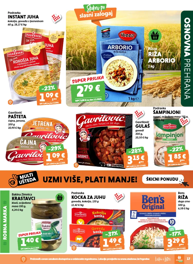 osnovna prehrana uzmi više, plati manje! škicni ponudu 17 bens riža dugo zrno 500 g, 6,58 €/kg -17% 3 29 € mpc 3,99 € na dan 2.5.2025. 3 9 9 € podravka kocka za juhu goveđa, kokošja, 120 g 12,42 €/kg -31% 1 49 € mpc 2,19 € na dan 2.5.2025. 2 1 9 € podravka instant juha kokošja, goveđa s tjesteninom 60 g, 18,17 €/kg -23% 1 09 € mpc 1,43 € na dan 2.5.2025. 1 4 3 € gavrilović gulaš goveđi 300 g, 10,50 €/kg -28% 3 15 € mpc 4,39 € na dan 2.5.2025. 4 3 9 € robna marka 1 40 € mpc 2,03 € na dan 2.5.2025. super prilika bakina zimnica krastavci kiseli, ocijeđena masa 330 g, 4,24 €/kg 2 79 € mpc 2,99 € na dan 2.5.2025. super prilika rizza riža arborio 1 kg gavrilović pašteta čajna, jetrena, 100 g 10,90 €/kg -29% 1 09 € mpc 1,52 € na dan 2.5.2025. 1 5 5 € podravka šampinjoni rezani, ocijeđena masa 220 g, 8,41 €/kg -22% 1 85 € mpc 2,34 € na dan 2.5.2025. 2 3 9 € proizvodi s ovom oznakom dostupni su u odabranim trgovinama. lokacije provjerite na www.studenac.hr/trgovine skokni po slasni zalogaj