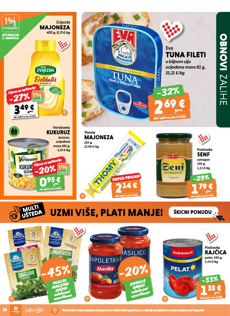 aplikacija ili kartica uzmi više, plati manje! škicni ponudu 18 proizvodi s ovom oznakom dostupni su u odabranim trgovinama. lokacije provjerite na www.studenac.hr/trgovine eva tuna fileti u biljnom ulju ocijeđena masa 81 g, 33,21 €/kg -32% 2 69 € mpc 3,89 € na dan 2.5.2025. 3 9 9 € podravka senf estragon 350 g, 5,11 €/kg -29% 1 79 € mpc 2,49 € na dan 2.5.2025. 2 5 5 € thomy majoneza 165 g, 12,96 €/kg 2 14 € mpc 2,70 € na dan 2.5.2025. super prilika podravka rajčica pelat, 240 g, 5,54 €/kg -33% 1 33 € mpc 2,13 € na dan 2.5.2025. 1 9 9 € -20% barilla umaci odabrani asortiman -45% vegeta maestro začini odabrani asortiman zvijezda majoneza 400 g, 8,73 €/kg verdeamo kukuruz šećerac, ocijeđena masa 285 g, 3,33 €/kg 0 95 € mpc 1,39 € na dan 2.5.2025. 1 20 € cijena uz aplikaciju -20% 3 49 € mpc 4,49 € na dan 2.5.2025. 4 79 € cijena uz aplikaciju -27% obnovi zalihe