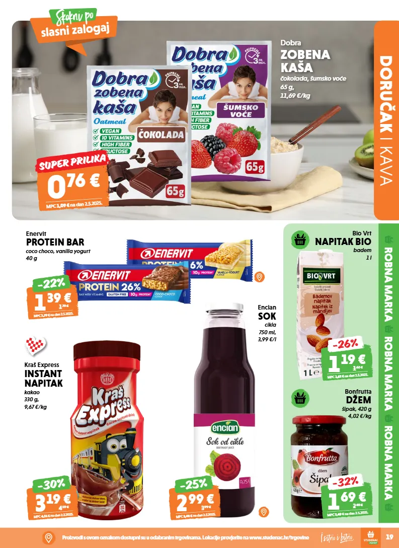 doručak i kava 19 robna marka robna marka robna marka bio vrt napitak bio badem 1 l bonfrutta džem šipak, 420 g 4,02 €/kg -32% 1 69 € mpc 2,49 € na dan 2.5.2025. 2 4 9 € encian sok cikla 750 ml, 3,99 €/l -25% 2 99 € mpc 3,48 € na dan 2.5.2025. 3 9 9 € kraš express instant napitak kakao 330 g, 9,67 €/kg -30% 3 19 € mpc 4,31 € na dan 2.5.2025. 4 5 9 € enervit protein bar coco choco, vanilla yogurt 40 g -22% 1 39 € mpc 1,79 € na dan 2.5.2025. 1 7 9 € 0 76 € mpc 1,09 € na dan 2.5.2025. super prilika -26% 1 19 € mpc 1,62 € na dan 2.5.2025. 1 6 2 € dobra zobena kaša čokolada, šumsko voće 65 g, 11,69 €/kg proizvodi s ovom oznakom dostupni su u odabranim trgovinama. lokacije provjerite na www.studenac.hr/trgovine skokni po slasni zalogaj