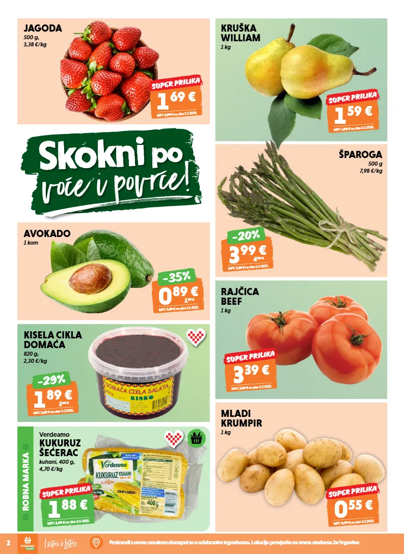 po skokni voće i povrće! 2 proizvodi s ovom oznakom dostupni su u odabranim trgovinama. lokacije provjerite na www.studenac.hr/trgovine mladi krumpir 1 kg avokado 1 kom -35% 0 89 € mpc 1,39 € na dan 2.5.2025. 1 3 9 € jagoda 500 g, 3,38 €/kg 1 69 € mpc 3,99 € na dan 2.5.2025. super prilika kruška william 1 kg 1 59 € mpc 1,99 € na dan 2.5.2025. super prilika šparoga 500 g 7,98 €/kg -20% 3 99 € mpc 1,39 € na dan 2.5.2025. 4 9 9 € rajčica beef 1 kg 3 39 € mpc 1,99 € na dan 2.5.2025. super prilika 0 55 € mpc 0,99 € na dan 2.5.2025. super prilika 1 88 € mpc 2,49 € na dan 2.5.2025. super prilika -29% 1 89 € mpc 2,69 € na dan 2.5.2025. 2 6 9 € kisela cikla domaća 820 g, 2,30 €/kg verdeamo kukuruz šećerac kuhani, 400 g, 4,70 €/kg robna marka