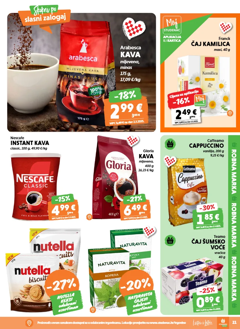 21 -18% 2 99 € mpc 3,49 € na dan 2.5.2025. 3 6 5 € -20% naturavita čajevi odabrani asortiman -27% nutella keksi odabrani asortiman robna marka robna marka robna marka teamo čaj šumsko voće vrećica 40 g caffeamo cappuccino vanilija, 200 g 9,25 €/kg -30% 1 85 € mpc 2,49 € na dan 2.5.2025. 2 6 5 € gloria kava mljevena, 400 g 16,23 €/kg -21% 6 49 € mpc 7,79 € na dan 2.5.2025. 8 2 5 € arabesca kava mljevena, minas 175 g, 17,09 €/kg -25% 0 89 € mpc 1,19 € na dan 2.5.2025. 1 1 9 € -15% 4 99 € mpc 5,69 € na dan 2.5.2025. 5 8 9 € nescafe instant kava classic, 100 g, 49,90 €/kg proizvodi s ovom oznakom dostupni su u odabranim trgovinama. lokacije provjerite na www.studenac.hr/trgovine franck čaj kamilica maxi, 40 g 2 , 49 € mpc 2,99 € na dan 2.5.2025. 2 , 9 9 € cijena uz aplikaciju -16% aplikacija ili kartica skokni po slasni zalogaj