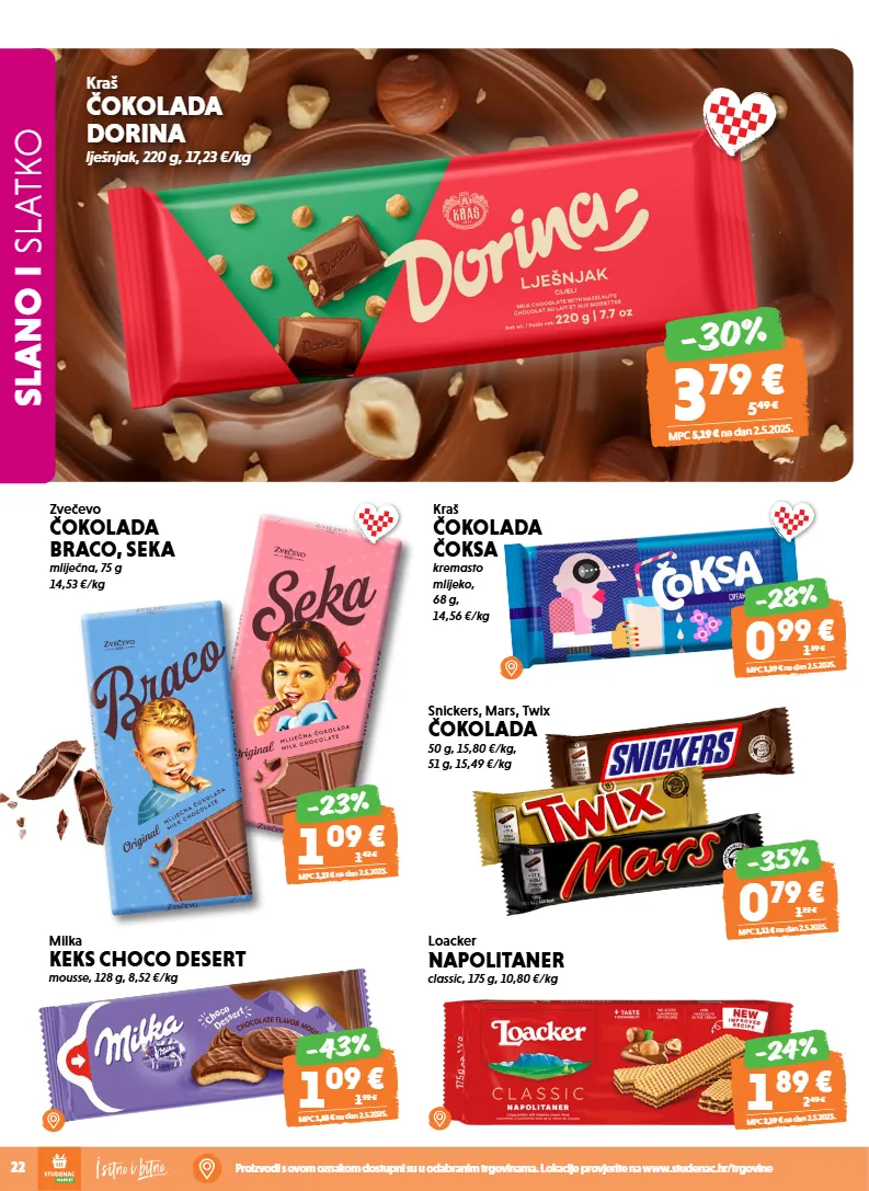 22 22 proizvodi s ovom oznakom dostupni su u odabranim trgovinama. lokacije provjerite na www.studenac.hr/trgovine slano i slatko -30% 3 79 € mpc 5,19 € na dan 2.5.2025. 5 4 9 € kraš čokolada dorina lješnjak, 220 g, 17,23 €/kg kraš čokolada čoksa kremasto mlijeko, 68 g, 14,56 €/kg -28% 0 99 € mpc 1,39 € na dan 2.5.2025. 1 3 9 € zvečevo čokolada braco, seka mliječna, 75 g 14,53 €/kg snickers, mars, twix čokolada 50 g, 15,80 €/kg, 51 g, 15,49 €/kg -23% 1 09 € mpc 1,22 € na dan 2.5.2025. 1 4 2 € -35% 0 79 € mpc 1,11 € na dan 2.5.2025. 1 2 2 € loacker napolitaner classic, 175 g, 10,80 €/kg -24% 1 89 € mpc 2,39 € na dan 2.5.2025. 2 4 9 € milka keks choco desert mousse, 128 g, 8,52 €/kg -43% 1 09 € mpc 1,83 € na dan 2.5.2025. 1 9 2 €