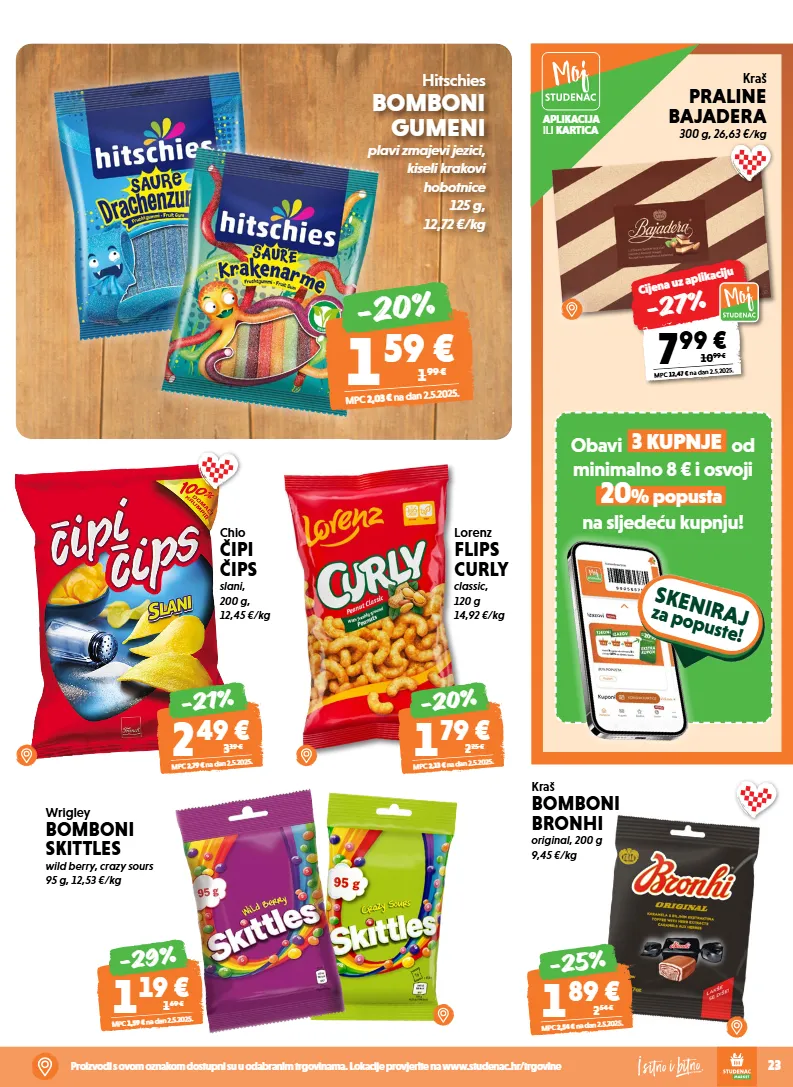 aplikacija ili kartica 23 proizvodi s ovom oznakom dostupni su u odabranim trgovinama. lokacije provjerite na www.studenac.hr/trgovine hitschies bomboni gumeni plavi zmajevi jezici, kiseli krakovi hobotnice 125 g, 12,72 €/kg -20% 1 59 € mpc 2,03 € na dan 2.5.2025. 1 9 9 € obavi od minimalno 8 € i osvoji na sljedeću kupnju! 3 kupnje 20 % popusta skeniraj za popuste! chio čipi čips slani, 200 g, 12,45 €/kg -21% 2 49 € mpc 2,79 € na dan 2.5.2025. 3 1 9 € lorenz flips curly classic, 120 g 14,92 €/kg wrigley bomboni skittles wild berry, crazy sours 95 g, 12,53 €/kg kraš bomboni bronhi original, 200 g 9,45 €/kg -25% 1 89 € mpc 2,54 € na dan 2.5.2025. 2 5 4 € kraš praline bajadera 300 g, 26,63 €/kg 7 , 99 € mpc 12,47 € na dan 2.5.2025. 1 0 , 9 9 € cijena uz aplikaciju -27% -20% 1 79 € mpc 2,13 € na dan 2.5.2025. 2 2 5 € -29% 1 19 € mpc 1,59 € na dan 2.5.2025. 1 6 9 €