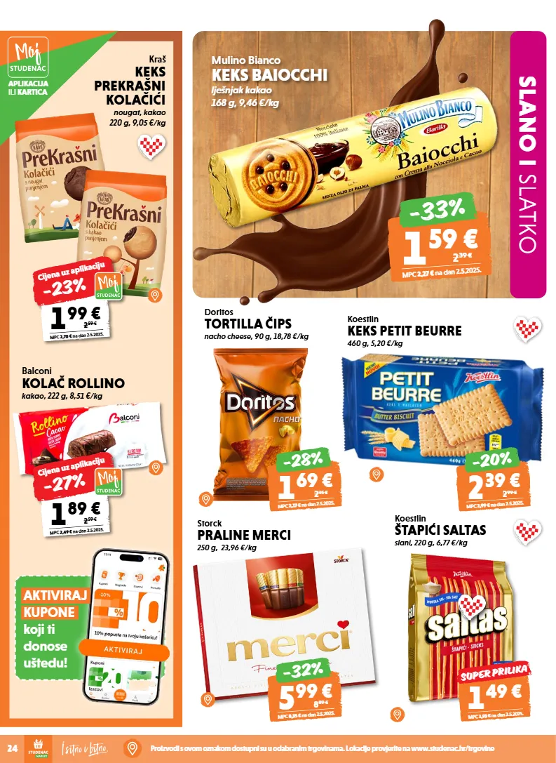 kraš keks prekrašni kolačići nougat, kakao 220 g, 9,05 €/kg balconi kolač rollino kakao, 222 g, 8,51 €/kg 1 , 89 € mpc 2,49 € na dan 2.5.2025. 2 , 5 9 € cijena uz aplikaciju -27% 20 aplikacija ili kartica proizvodi s ovom oznakom dostupni su u odabranim trgovinama. lokacije provjerite na www.studenac.hr/trgovine slano i slatko aktiviraj kupone koji ti donose uštedu! mulino bianco keks baiocchi lješnjak kakao 168 g, 9,46 €/kg koestlin keks petit beurre 460 g, 5,20 €/kg -20% 2 39 € mpc 2,99 € na dan 2.5.2025. 2 9 9 € -32% 5 99 € mpc 8,35 € na dan 2.5.2025. 8 8 9 € storck praline merci 250 g, 23,96 €/kg doritos tortilla čips nacho cheese, 90 g, 18,78 €/kg -28% 1 69 € mpc 2,17 € na dan 2.5.2025. 2 3 5 € koestlin štapići saltas slani, 220 g, 6,77 €/kg 1 49 € mpc 1,93 € na dan 2.5.2025. super prilika 1 , 99 € mpc 2,70 € na dan 2.5.2025. 2 , 5 9 € cijena uz aplikaciju -23% -33% 1 59 € mpc 2,27 € na dan 2.5.2025. 2 3 9 € 24
