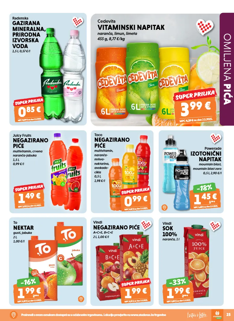 cedevita vitaminski napitak naranča, limun, limeta 455 g, 8,77 €/kg 3 99 € mpc 4,19 € na dan 2.5.2025. super prilika to nektar gusti, jabuka 2 l, 1,00 €/l vindi negazirano piće a+c+e, b+c+e 2 l, 1,00 €/l -16% 1 99 € mpc 2,59 € na dan 2.5.2025. 2 5 9 € radenska gazirana mineralna, prirodna izvorska voda 1,5 l, 0,57 €/l 0 85 € mpc 0,99 € na dan 2.5.2025. super prilika omiljena pića powerade izotonični napitak mountain blast, mountain blast zero 0,5 l, 2,90 €/l juicy fruits negazirano piće multivitamin, crvena naranča-jabuka 1,5 l, 0,99 €/l 0 99 € mpc 1,07 € na dan 2.5.2025. super prilika toco negazirano piće multivitamin, naranča- mrkva- nektarina, avokado- cikla 0,5 l, 1,98 €/l -18% 1 45 € mpc 1,65 € na dan 2.5.2025. 1 7 9 € 1 49 € mpc 1,72 € na dan 2.5.2025. super prilika vindi sok 100% naranča, 1 l 1 99 € mpc 2,79 € na dan 2.5.2025. super prilika proizvodi s ovom oznakom dostupni su u odabranim trgovinama. lokacije provjerite na www.studenac.hr/trgovine 25 -33% 1 99 € mpc 2,85 € na dan 2.5.2025. 2 9 9 €