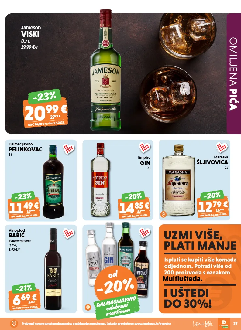 27 proizvodi s ovom oznakom dostupni su u odabranim trgovinama. lokacije provjerite na www.studenac.hr/trgovine multiušteda. maraska šljivovica 1 l dalmacijavino pelinkovac 1 l -20% 12 79 € mpc 16,02 € na dan 2.5.2025. 1 6 0 2 € vinoplod babić kvalitetno vino 0,75 l, 8,92 €/l -21% 6 69 € mpc 8,49 € na dan 2.5.2025. 8 4 9 € omiljena pića jameson viski 0,7 l, 29,99 €/l -23% 11 49 € mpc 14,59 € na dan 2.5.2025. 1 5 0 9 € empire gin 1 l -20% dalmacijavino odabrani asortiman od -23% 20 99 € mpc 24,50 € na dan 2.5.2025. 2 7 2 9 € -20% 14 85 € mpc 13,79 € na dan 2.5.2025. 1 3 7 9 €