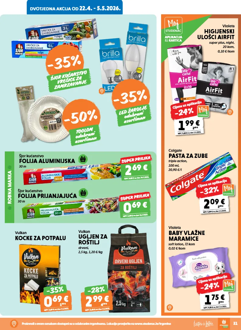 robna marka dvotjedna akcija od 22.4. - 5.5.2026. 31 aplikacija ili kartica colgate pasta za zube triple action, 100 ml, 20,90 €/l vulkan ugljen za roštilj drveni, 2,5 kg, 1,20 €/kg -28% 2 99 € mpc 2,43 € na dan 2.5.2025. 4 1 9 € -35% led žarulje odabrani asortiman -35% šjor kućanstvo vrećice za zamrzavanje proizvodi s ovom oznakom dostupni su u odabranim trgovinama. lokacije provjerite na www.studenac.hr/trgovine -50% toolom odabrani asortiman 2 , 09 € mpc 3,59 € na dan 2.5.2025. 3 , 0 9 € cijena uz aplikaciju -32% šjor kućanstvo folija aluminijska 30 m šjor kućanstvo folija prijanjajuća 30 m 2 69 € mpc 3,95 € na dan 16.7.2025. super prilika 0 69 € mpc 1,10 € na dan 16.7.2025. super prilika vulkan kocke za potpalu -35% 0 69 € mpc 1,07 € na dan 2.5.2025. 1 0 7 € violeta baby vlažne maramice soft lotion, 72 kom 0,02 €/kom 1 , 75 € mpc 2,33 € na dan 2.5.2025. 2 , 3 3 € cijena uz aplikaciju -24% violeta higijenski ulošci airfit super plus, night, 20 kom, 0,10 €/kom 1 , 99 € mpc 2,65 € na dan 2.5.2025. 2 , 6 5 € cijena uz aplikaciju -24%