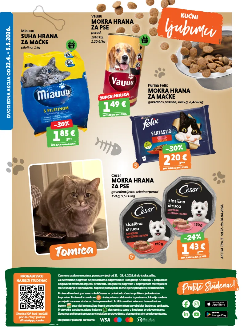 p ra t i t e s t udenac! mogućnost plaćanja karticama: pronađi svoj najbliži studenac skeniraj qr kod i pošalji poruku "hej" putem whatsapp poruke cijene su izražene u eurima, ponuda vrijedi od 22. - 28. 4. 2026. ili do isteka zaliha. za eventualne pogreške ne preuzimamo odgovornost. fotografije ne moraju u potpunosti odgovarati stvarnom izgledu proizvoda. moguće su pogreške u objavljenom materijalu za što se unaprijed ispričavamo. kupci se pozivaju da točne cijene provjere u prodavaonici. proizvodi su dostupni samo u količinama za potrebe kućanstva prilikom jednokratne kupovine. proizvodi s oznakom dostupni su u odabranim trgovinama, lokacije možete provjeriti na www.studenac.hr/supermarketi. artikli označeni zelenom i narančastom bojom su artikli koje možete kupiti po povoljnijoj cijeni uz vašu moj studenac aplikaciju. proizvodi s oznakom zelene košarice dostupni su samo u studenac prodavaonicama. zbog ograničenosti prostora svi oglašeni proizvodi nisu dostupni u svim prodavaonicama. ljubimci kućni tomica dvotjedna akcija od 22.4. - 5.5.2026. cesar mokra hrana za pse govedina/jetra, teletina/perad 150 g, 9,53 €/kg purina felix mokra hrana za mačke govedina i piletina, 4x85 g, 6,47 €/kg miauuu suha hrana za mačke piletina, 1 kg vauuu mokra hrana za pse perad, 1240 kg, 1,20 €/kg -30% 2 20 € mpc 3,01 € na dan 2.5.2025. 3 1 5 € -24% 1 43 € mpc 1,89 € na dan 2.5.2025. 1 8 9 € akcija traje od 22. do 28.04.2026. -30% 1 85 € mpc 2,74 € na dan 2.5.2025. 2 65 € 1 49 € mpc 2,19 € na dan 2.5.2025. super prilika