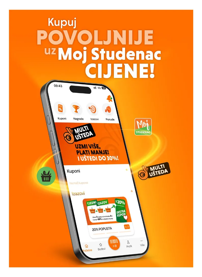doniraj bodove, pokloni ljetovanje! svoje bodove u aplikaciji moj studenac preusmjeri prema narančastoj ribici i zajedno s nama omogući ljetovanje djeci iz jednoroditeljskih obitelji. doniraj bodove, pokloni ljetovanje! svoje bodove u aplikaciji moj studenac preusmjeri prema narančastoj ribici i zajedno s nama omogući ljetovanje djeci iz jednoroditeljskih obitelji. od srijede do utorka tjedna akcija 22. - 28. 4. 2026. ‘z bregov mlijeko trajno 2,8% m.m. 1 l banana 1 kg karlovačko pivo 6x0,5 l, 2,33 €/l kraš keks domaćica original, 300 g 8,30 €/kg violeta omekšivač original 900 ml, 2,21 €/l mystic 800 ml, 2,49 €/l -26% 1 99 € mpc 2,69 € na dan 2.5 i 23.7.2025. 2 6 9 € -33% 0 99 € mpc 1,49 € na dan 2.5.2025. 1 4 9 € -24% 2 49 € mpc 3,87 € na dan 2.5.2025. 3 2 9 € -16% 0 85 € mpc 1,02 € na dan 2.5.2025. 1 0 2 € 6 99 € mpc 8,15 € na dan 2.5.2025. super prilika uzmi više, plati manje! potra i više od 200 proizvoda s oznakom multiušteda i uštedi do 30%! cekin pileći file svježe, 400 g 12,88 €/kg -20% 5 , 15 € mpc 6,29 € na dan 2.5.2025. 6 4 5 € potraži više od 200 proizvoda s oznakom multiušteda i uštedi do 30%!