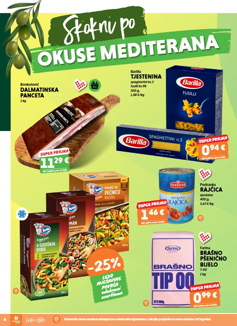 okuse mediterana bonkulović dalmatinska panceta 1 kg 11 29 € mpc 11,90 € na dan 2.5.2025. super prilika podravka rajčica sjeckana 400 g, 3,65 €/kg 1 46 € mpc 1,99 € na dan 2.5.2025. super prilika barilla tjestenina spaghettini br.3 fusilli br.98 500 g, 1,88 €/kg 0 94 € mpc 1,09 € na dan 2.5.2025. super prilika farina brašno pšenično bijelo t-00 1 kg 0 99 € mpc 1,39 € na dan 2.5.2025. super prilika -25% ledo mješavine povrća odabrani asortiman 6 proizvodi s ovom oznakom dostupni su u odabranim trgovinama. lokacije provjerite na www.studenac.hr/trgovine skokni po