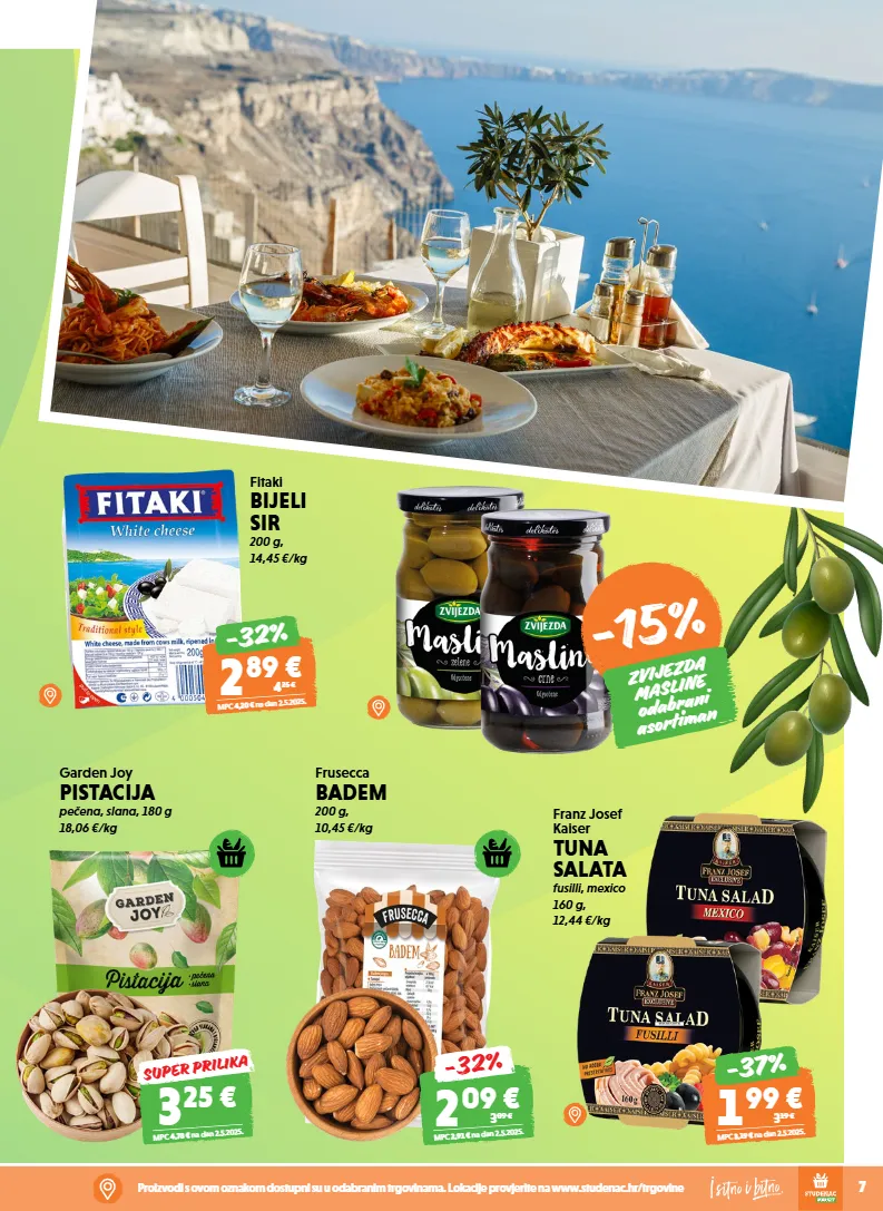 franz josef kaiser tuna salata fusilli, mexico 160 g, 12,44 €/kg -37% 1 99 € mpc 3,19 € na dan 2.5.2025. 3 1 9 € fitaki bijeli sir 200 g, 14,45 €/kg -32% 2 89 € mpc 4,20 € na dan 2.5.2025. 4 2 5 € garden joy pistacija pečena, slana, 180 g 18,06 €/kg frusecca badem 200 g, 10,45 €/kg -32% 2 09 € mpc 2,91 € na dan 2.5.2025. 3 0 9 € -15% zvijezda masline odabrani asortiman 3 25 € mpc 4,78 € na dan 2.5.2025. super prilika 7 proizvodi s ovom oznakom dostupni su u odabranim trgovinama. lokacije provjerite na www.studenac.hr/trgovine
