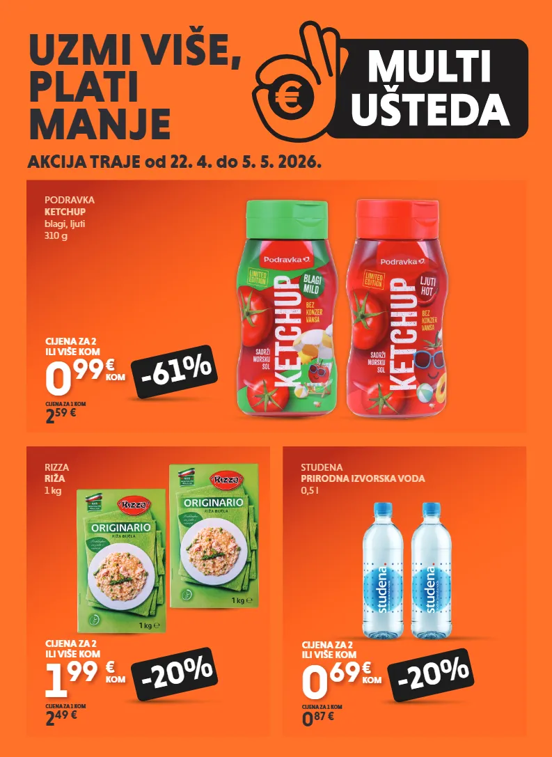uzmi više, plati manje akcija traje od 22. 4. do 5. 5. 2026. studena prirodna izvorska voda 0,5 l 0 69 0 87 € cijena za 1 kom -20% cijena za 2 ili više kom € kom rizza riža 1 kg 1 99 2 49 € cijena za 1 kom -20% cijena za 2 ili više kom € kom podravka ketchup blagi, ljuti 310 g 0 99 2 59 € cijena za 1 kom -61% cijena za 2 ili više kom € kom