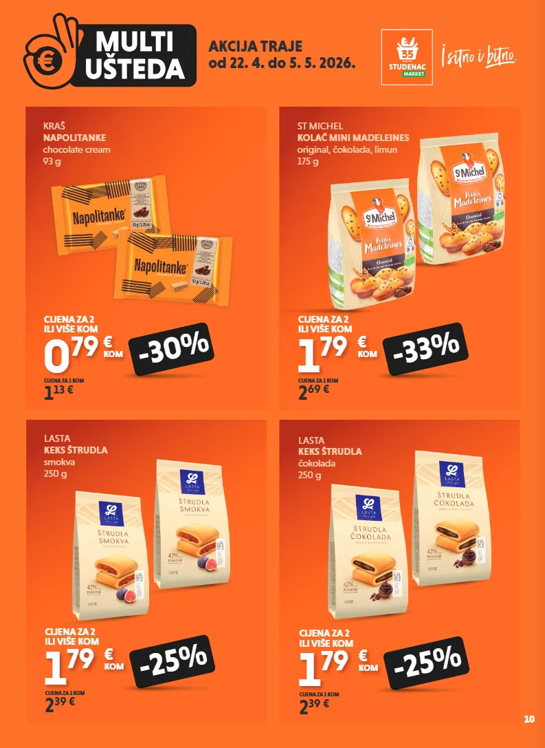 akcija traje od 22. 4. do 5. 5. 2026. 10 kraš napolitanke chocolate cream 93 g 0 79 1 13 € cijena za 1 kom -30% cijena za 2 ili više kom € kom lasta keks štrudla smokva 250 g 1 79 2 39 € cijena za 1 kom -25% cijena za 2 ili više kom € kom lasta keks štrudla čokolada 250 g 1 79 2 39 € cijena za 1 kom -25% cijena za 2 ili više kom € kom st michel kolač mini madeleines original, čokolada, limun 175 g 1 79 2 69 € cijena za 1 kom -33% cijena za 2 ili više kom € kom