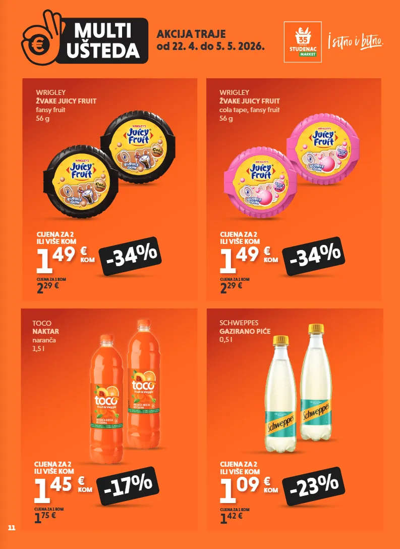 akcija traje od 22. 4. do 5. 5. 2026. 11 wrigley žvake juicy fruit cola tape, fansy fruit 56 g 1 49 2 29 € cijena za 1 kom -34% cijena za 2 ili više kom € kom 1 45 1 75 € cijena za 1 kom -17% cijena za 2 ili više kom € kom toco naktar naranča 1,5 l 1 09 1 42 € cijena za 1 kom -23% cijena za 2 ili više kom € kom schweppes gazirano piće 0,5 l wrigley žvake juicy fruit fansy fruit 56 g 1 49 2 29 € cijena za 1 kom -34% cijena za 2 ili više kom € kom
